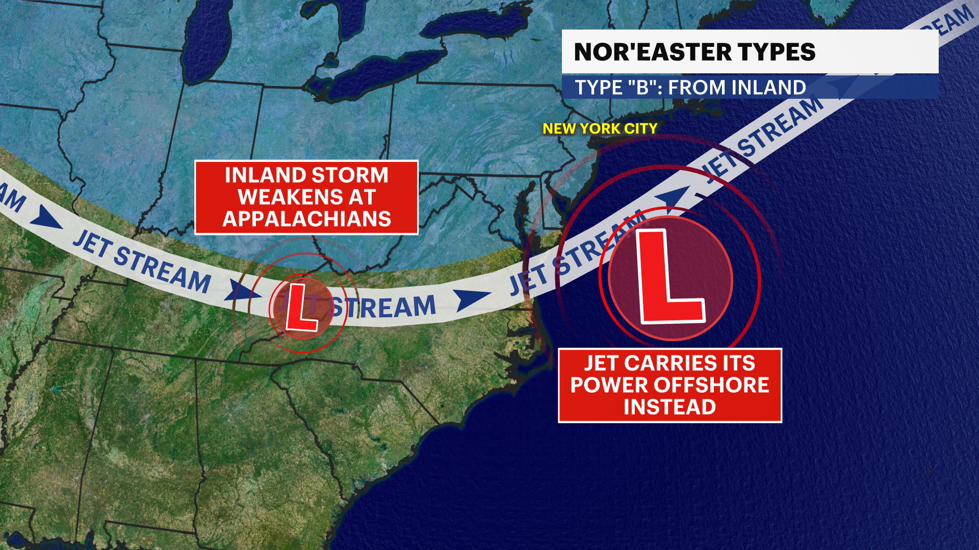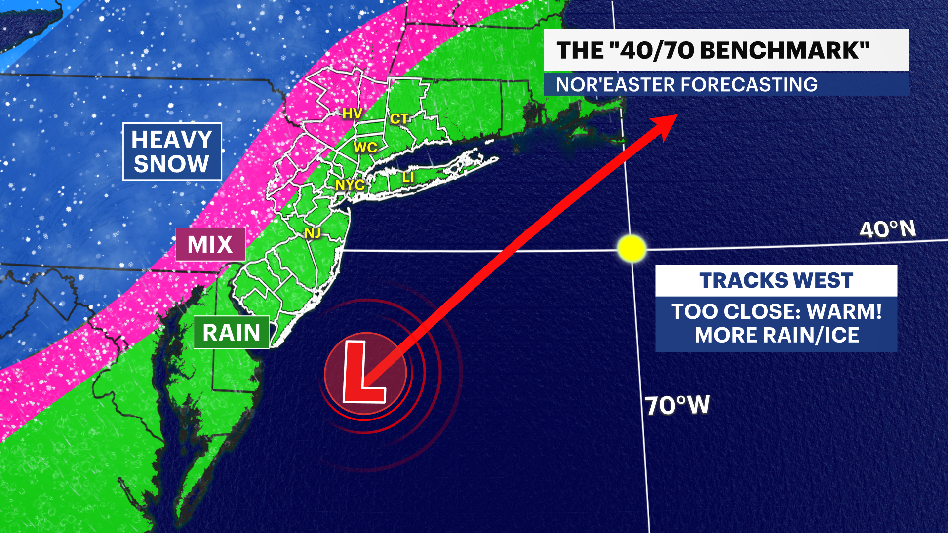 If the nor’easter passes west of benchmark, then the storm is too close to the coast where it may be warmer and produce rain across the coast. This would push snowy impacts far inland.