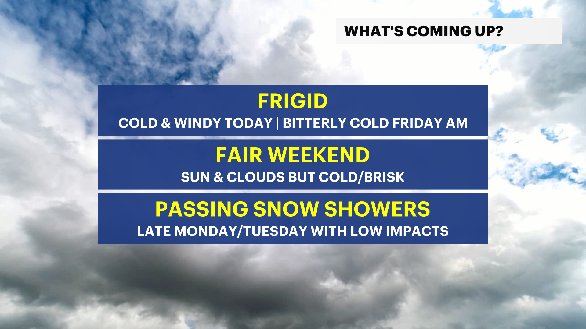 There is a possible Alberta Clipper headed to the Northeast for Mon/Tue which would bring meager impacts of a coating of light snow. This detail has high uncertainty, so it will be monitored throughout the weekend.