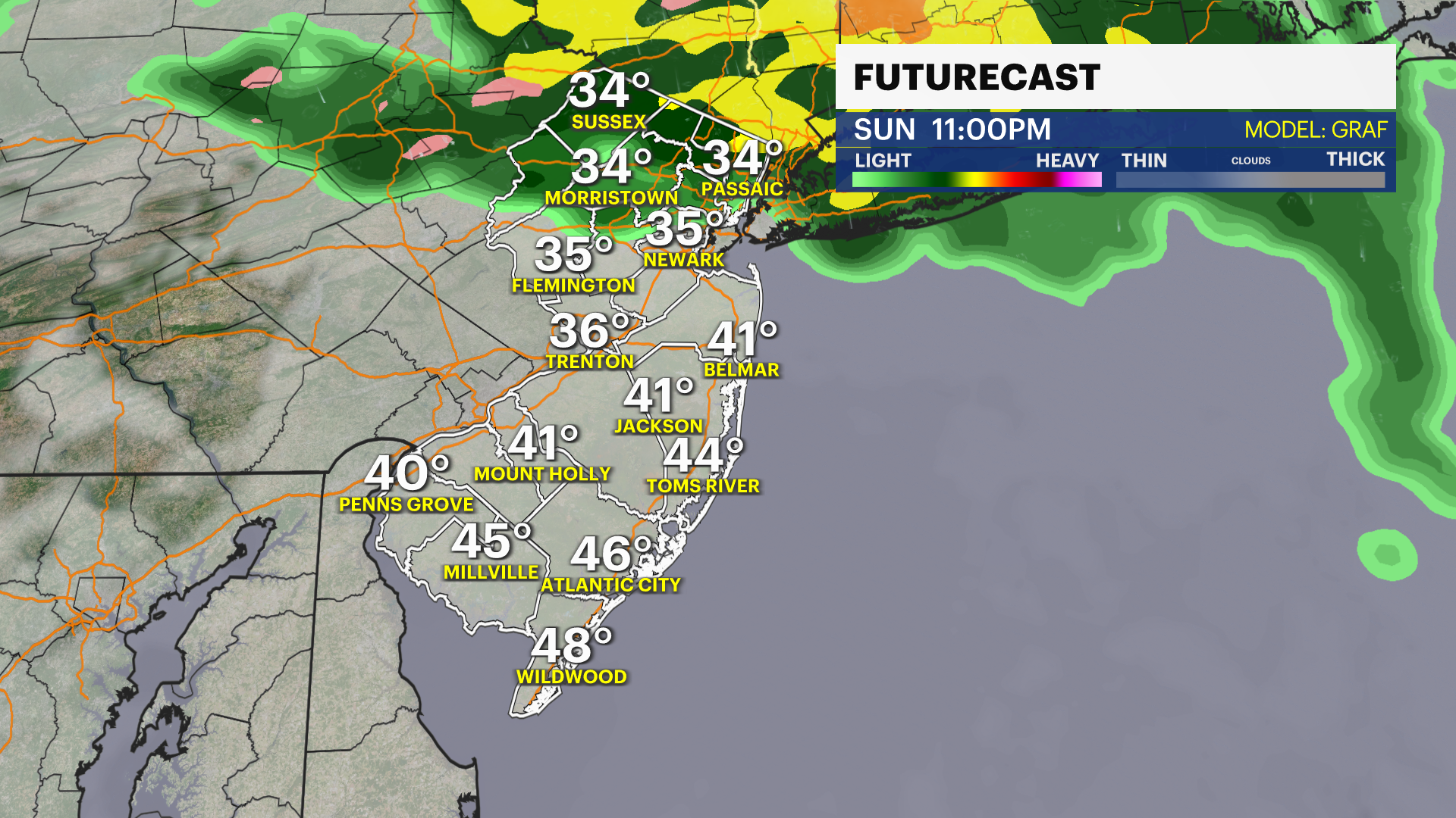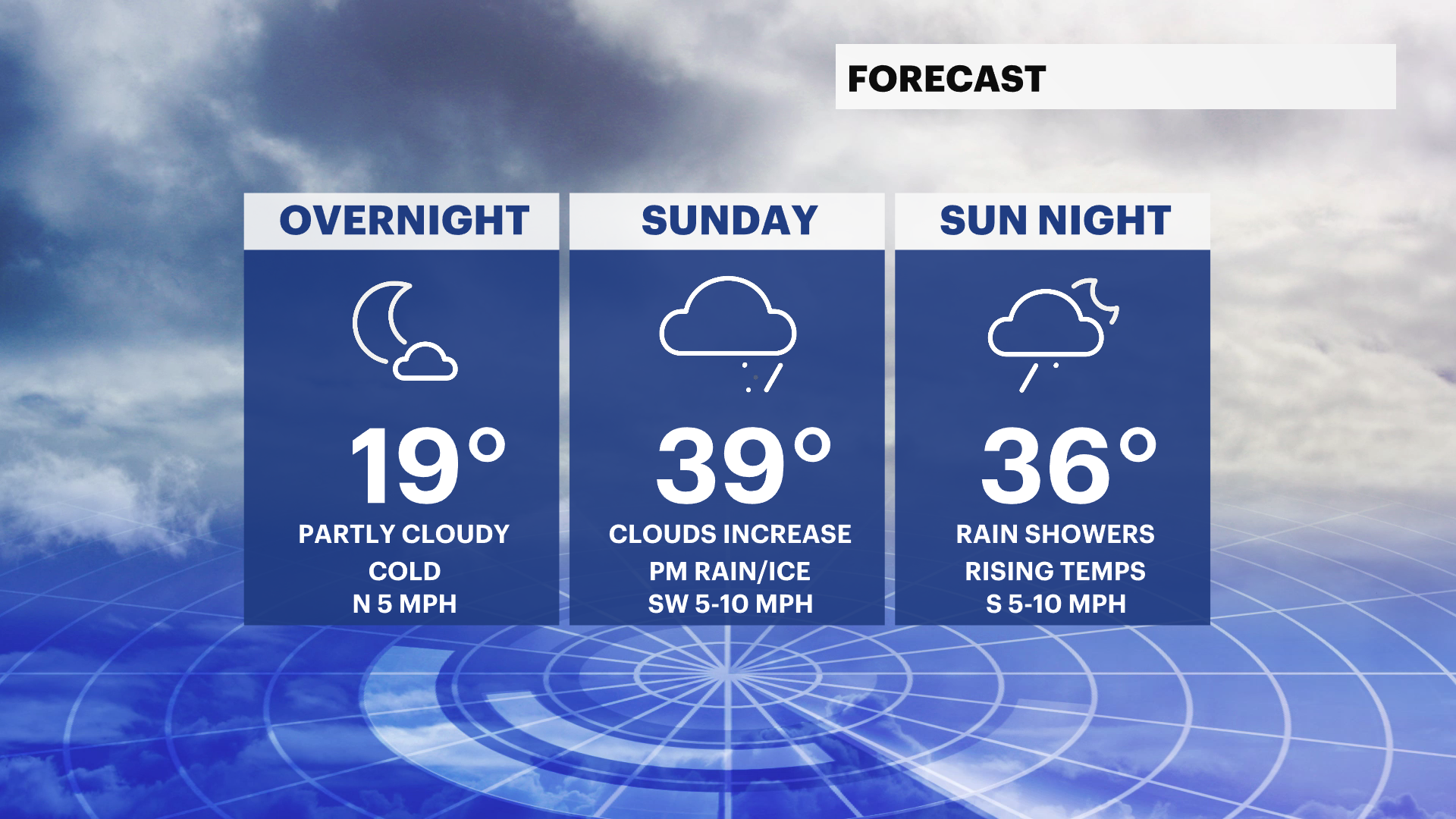 Sunday: Increasing clouds with a late-day chance of rain. Temperatures range from the upper 30s to near 40°, feeling cooler earlier with wind chills in the teens and 20s.