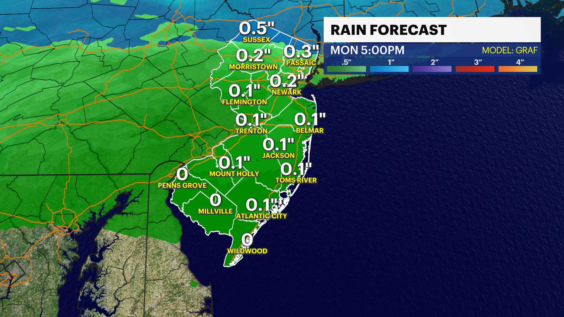 Monday: Periods of rain mainly during the morning, then drying out by afternoon. Milder with highs ranging from the upper 40s to near 50, breezy at times.