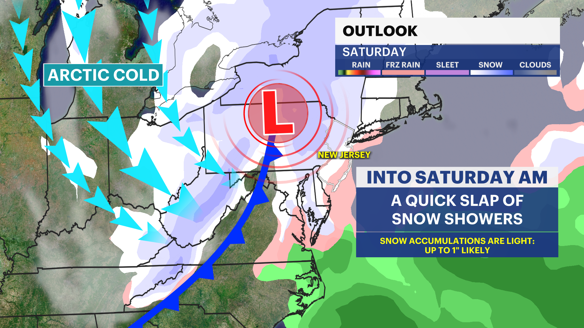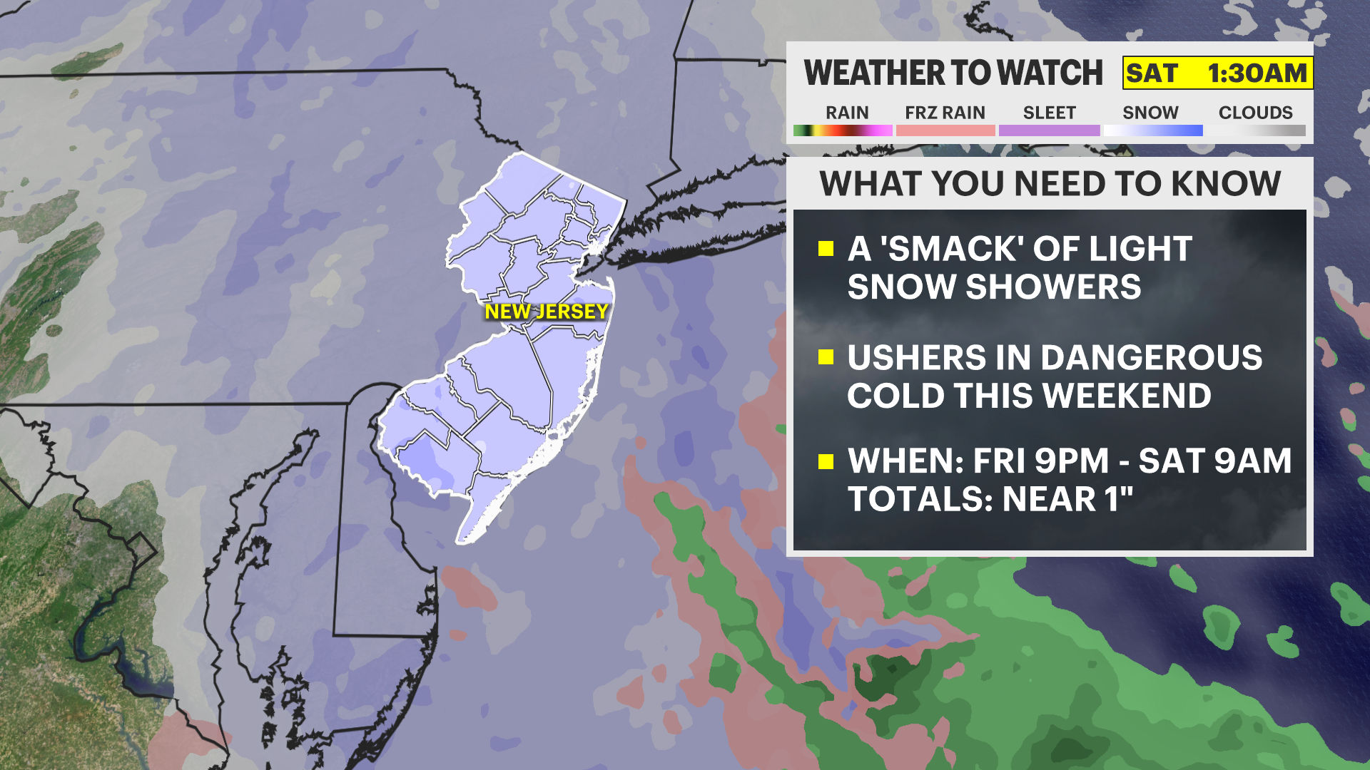 An Alberta Clipper rockets through New Jersey on Friday night, delivering a light coating of snow. This moves so quickly and in an environment with limited moisture that it doesn't accumulate much, only amounting to near an inch by Saturday morning. Shortly after the snow wraps up, the strong gusts arrive and reach near 40 mph throughout Saturday.