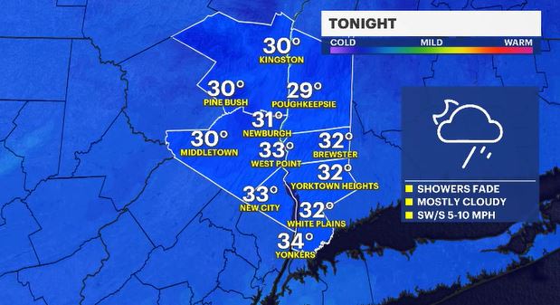 TONIGHT: Showers taper off overnight then clouds thin out heading into Wednesday. Lows: low 30s.