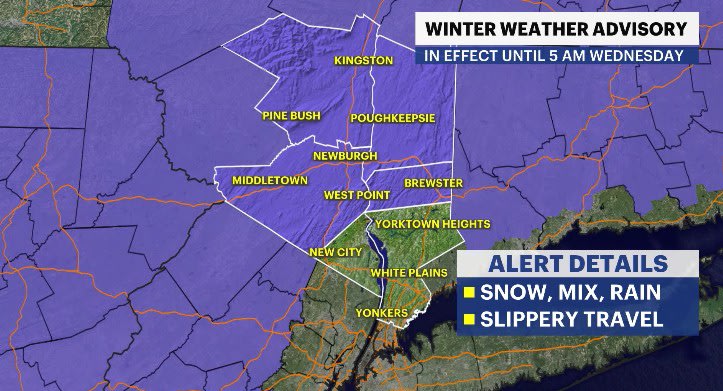 As the snow comes down, the main roads/highways will be wet while there could be some sticking on the side streets, grassy surfaces and elevated surfaces. Accumulations are expected to be very low, about a coating to an inch. A winter weather advisory is in effect across Putnam, Orange, Dutchess and Ulster counties until the latest, 5 a.m. Wednesday.