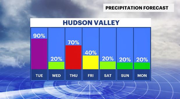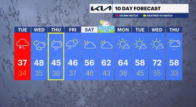 THURSDAY: WEATHER TO WATCH - Mostly cloudy with rain showers through the day. Highs: mid-40s. Lows: upper 30s.