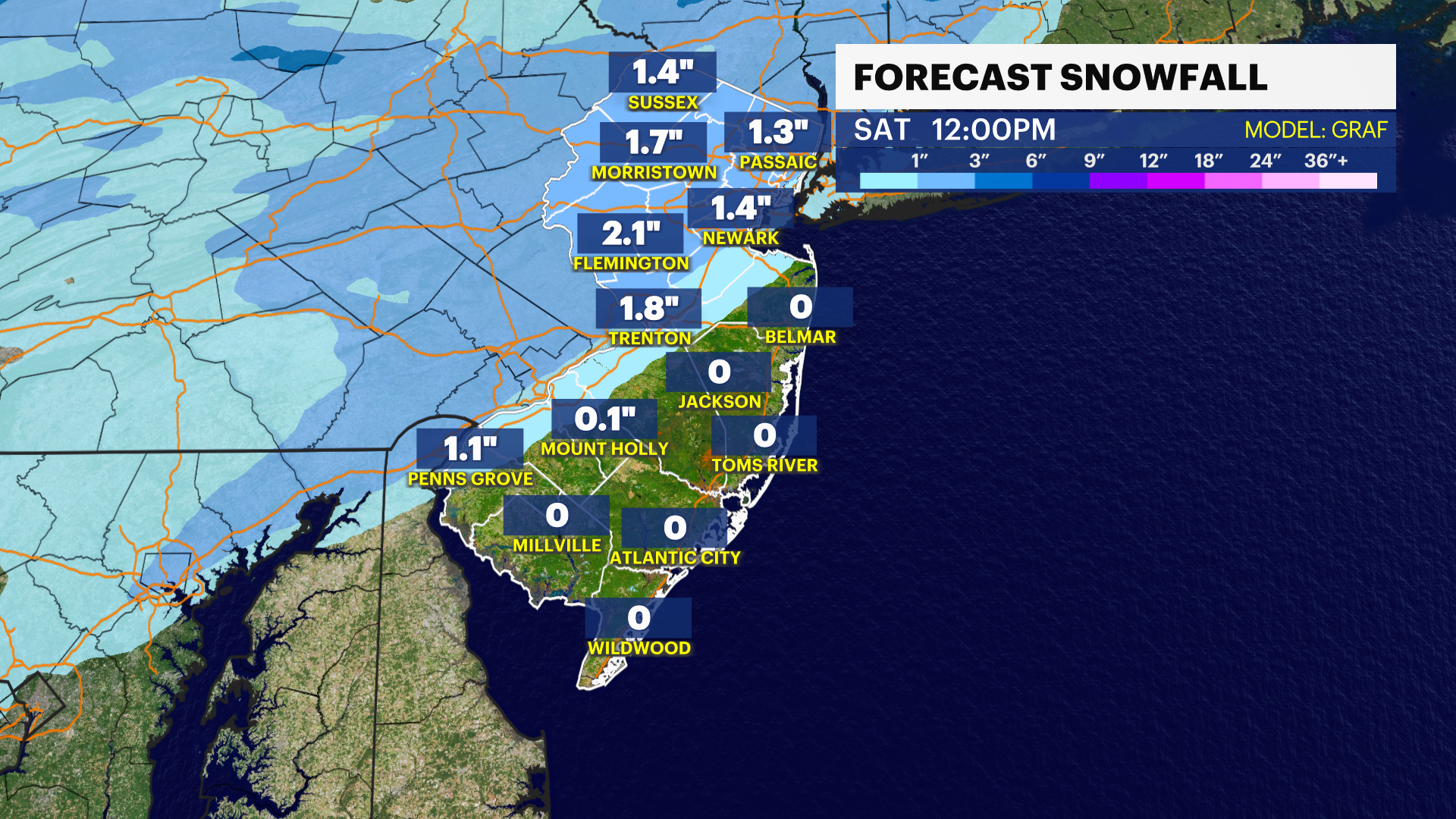 A split batch of snow and rain moves across New Jersey through the mid-morning Saturday, dropping about 1-2" of snow across most of the interior counties of the state. Rain will fall along coastal zones - south of Exit 105 on the Parkway through southern Monmouth and Ocean counties. This quick hit rolls across New Jersey in about three hours and then remains cloudy into the night. Cleanup is easy.