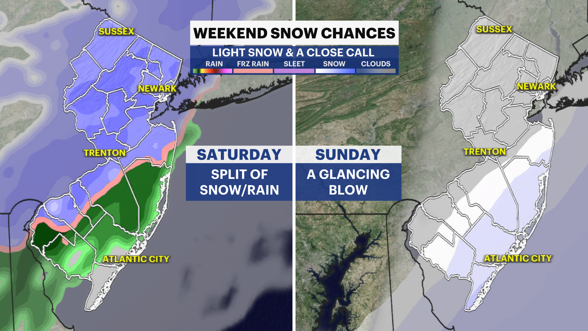 Sunday's weather is interesting as a nearby coastal storm is expected to give just a glancing blow to the Garden State. This means light snow is possible in the southern half of New Jersey - from Ocean County through Cape May.