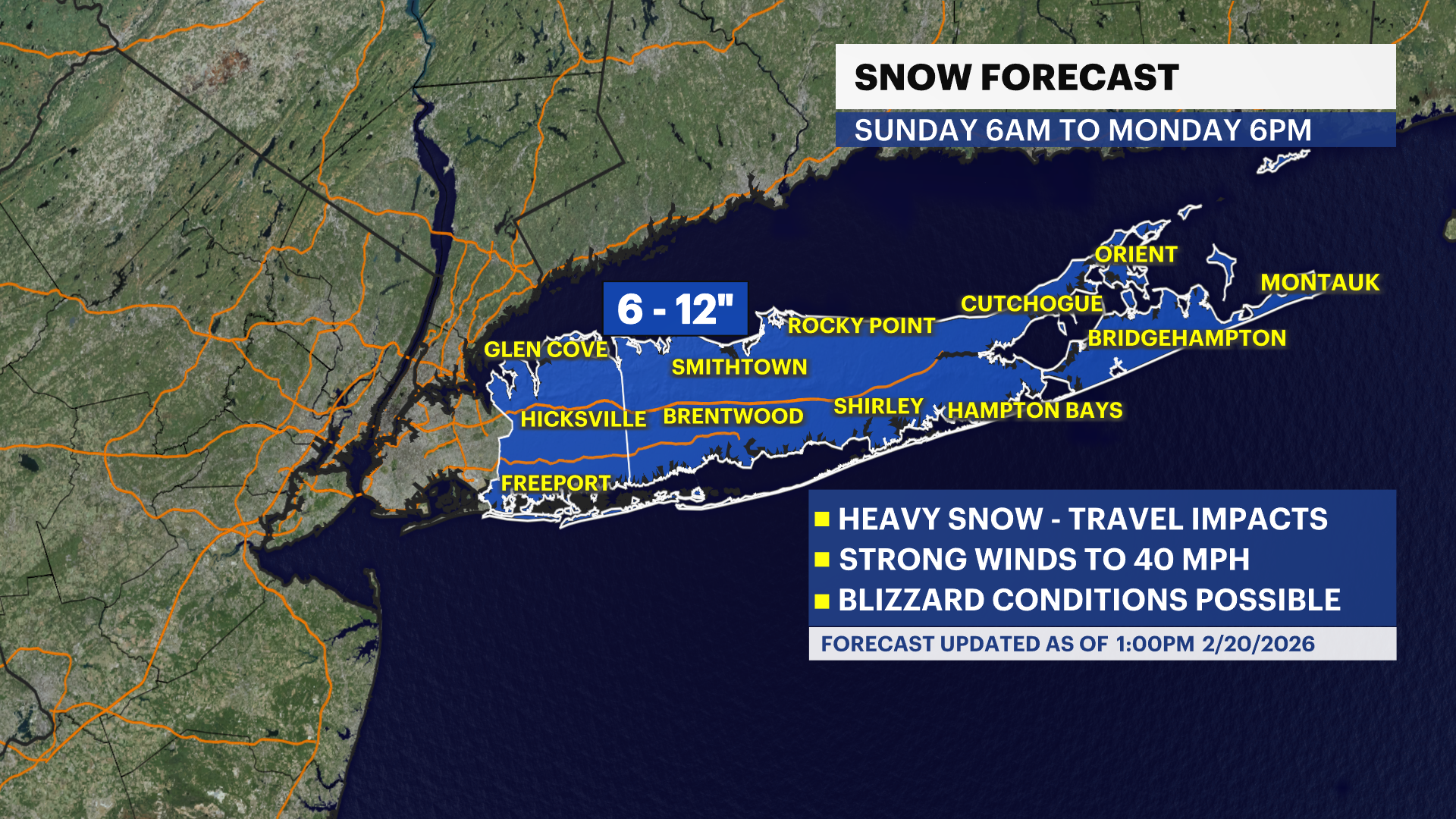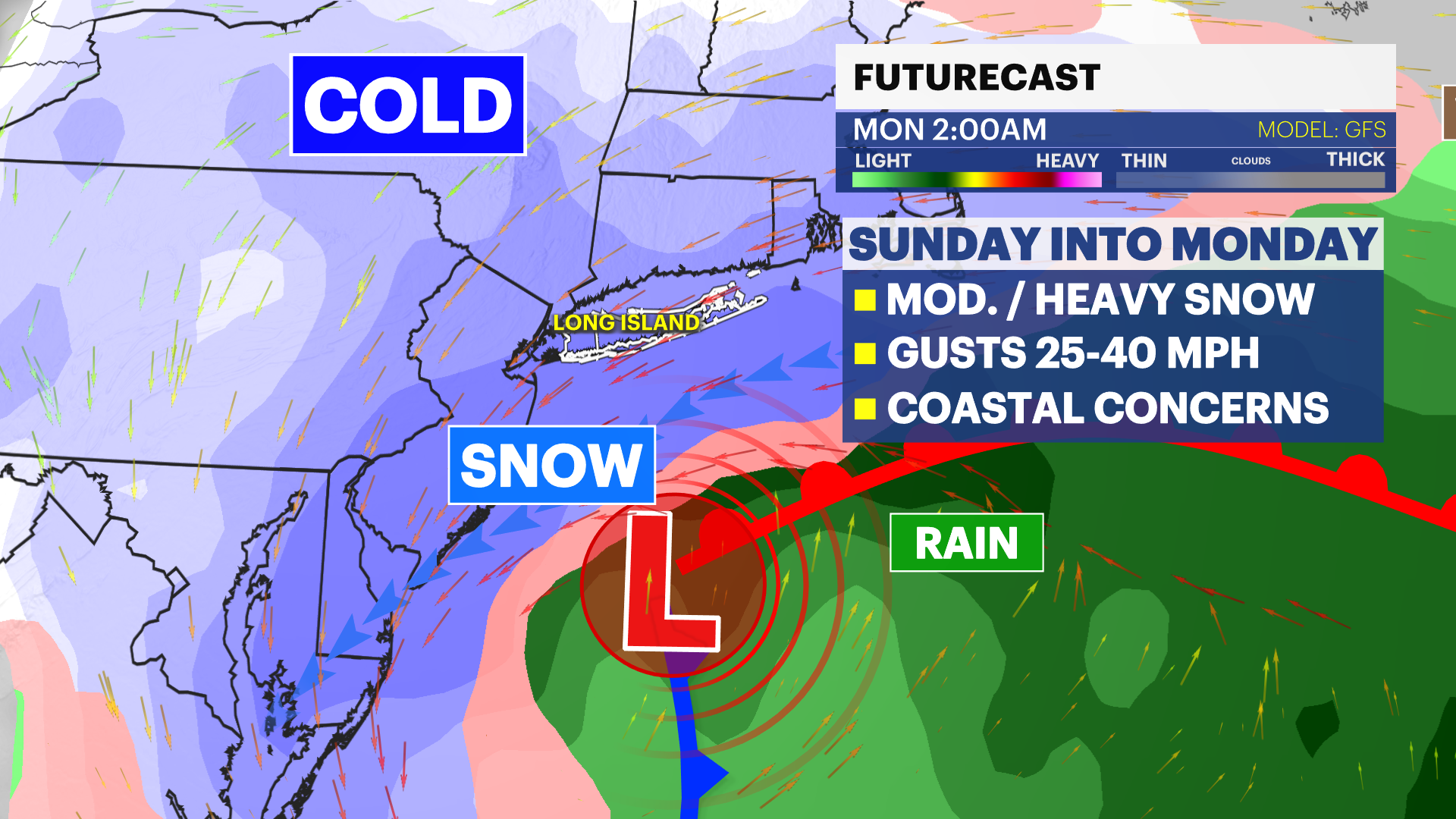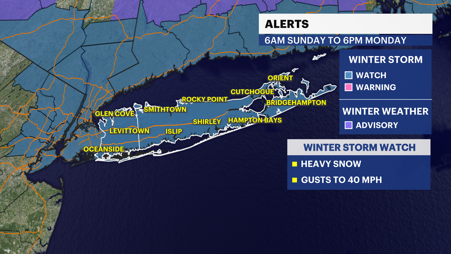 STORM ALERTS: A winter storm watch is posted for all of Long Island, issued from 6 a.m. Sunday to 6 p.m. Monday. There is also a coastal flood watch for moderate coastal flooding around 1.5 to 2.5 feet above ground level from 10 p.m. Sunday until 6 a.m. Monday.