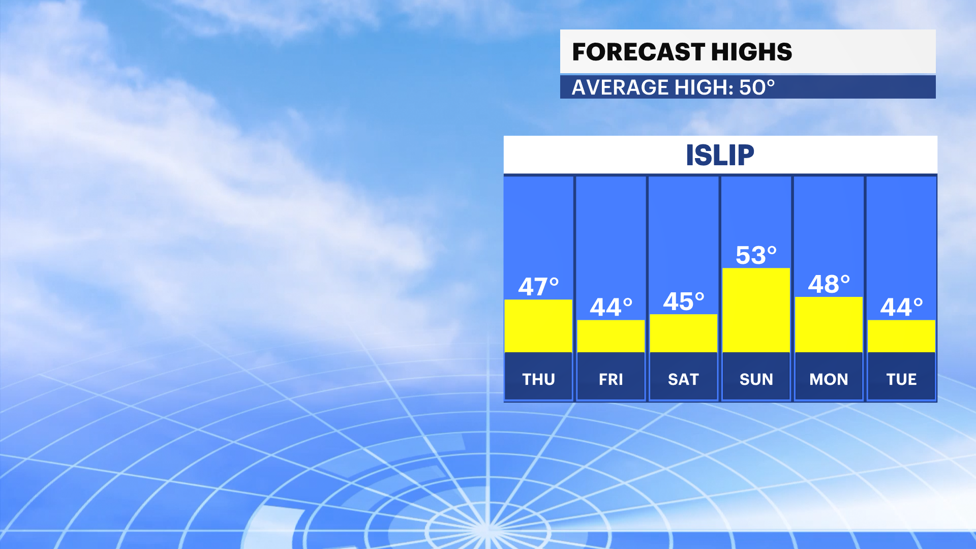 SUNDAY: Rain returns. Highs in the low 50s, lows in the high 30s.