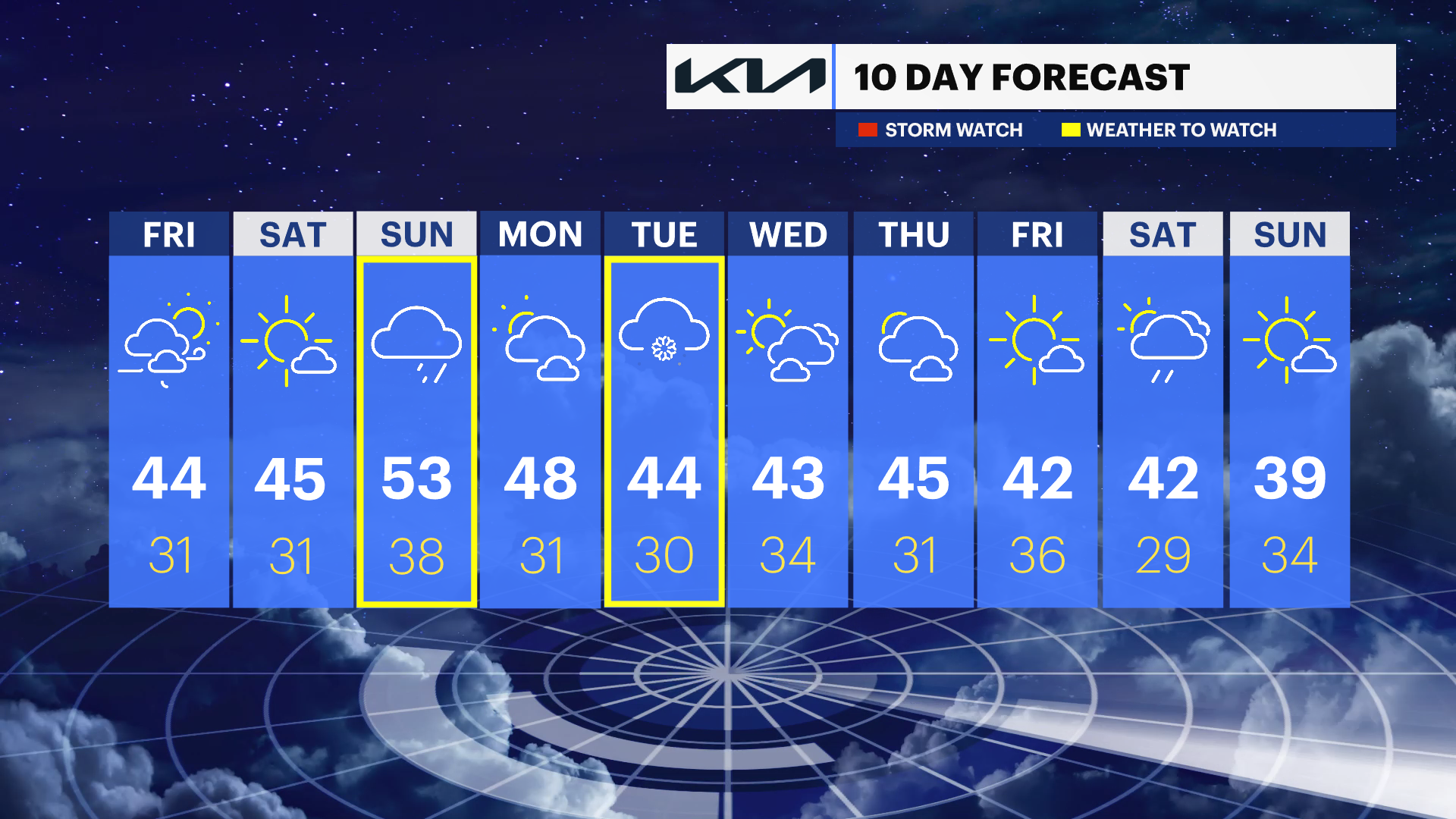 TUESDAY: Rain with wintery mix possible. Highs in the 40s, lows in the low 30s.
