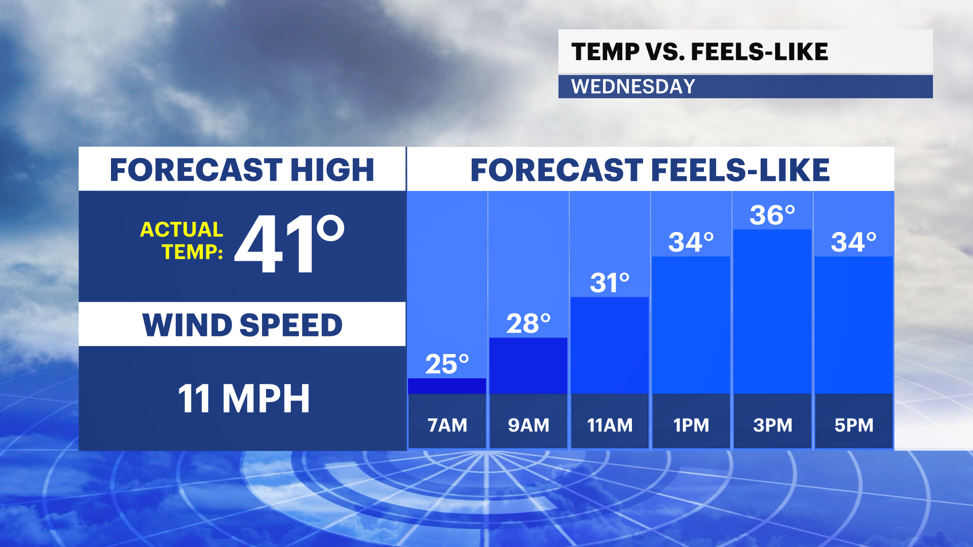 THURSDAY: Brisk and mostly sunny. Breezy. Feels-like temps in the 20s and 30s. High of 41.