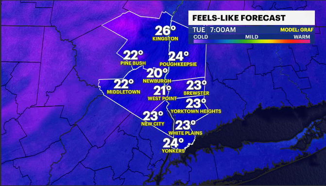 TUESDAY: Another cold morning, mostly sunny skies, but less wind. Highs in the mid-40s. Lows in the mid-30s.