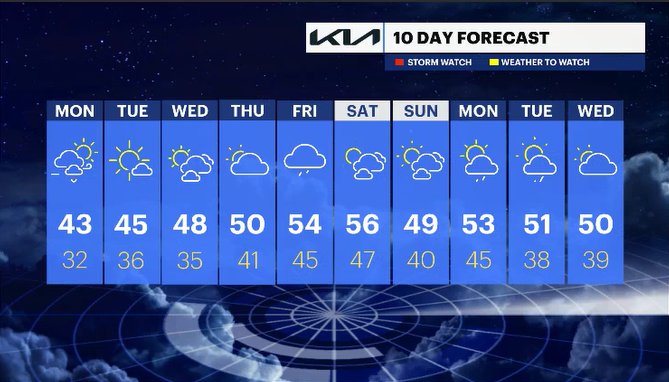WEDNESDAY: Sun and clouds, near seasonable temperatures. Highs in the upper 40s. Lows in the mid-30s.
