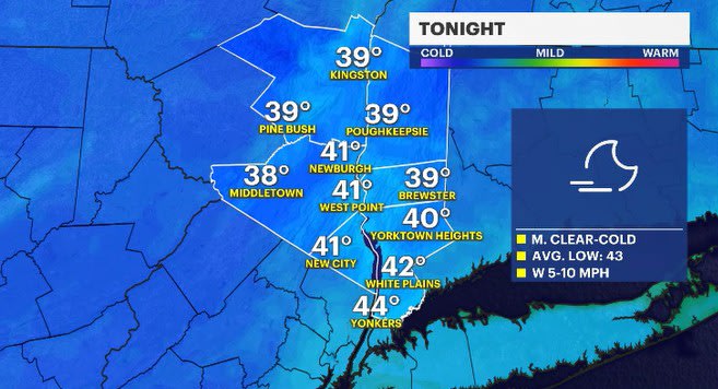 TONIGHT: Mostly clear and with a chill in the air. Lows: upper 30s to mid 40s.