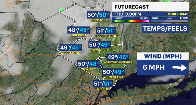 THURSDAY: Mostly cloudy with a chance of rain. Highs: mid 50s. Lows: upper 30s.