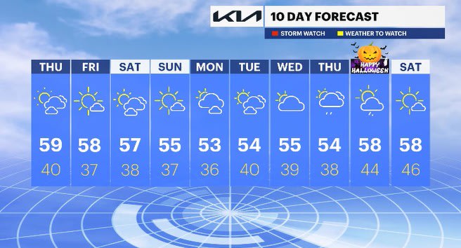 • Halloween is in sight in the 10-day Outlook and so far, that chance of rain lingers through the holiday.