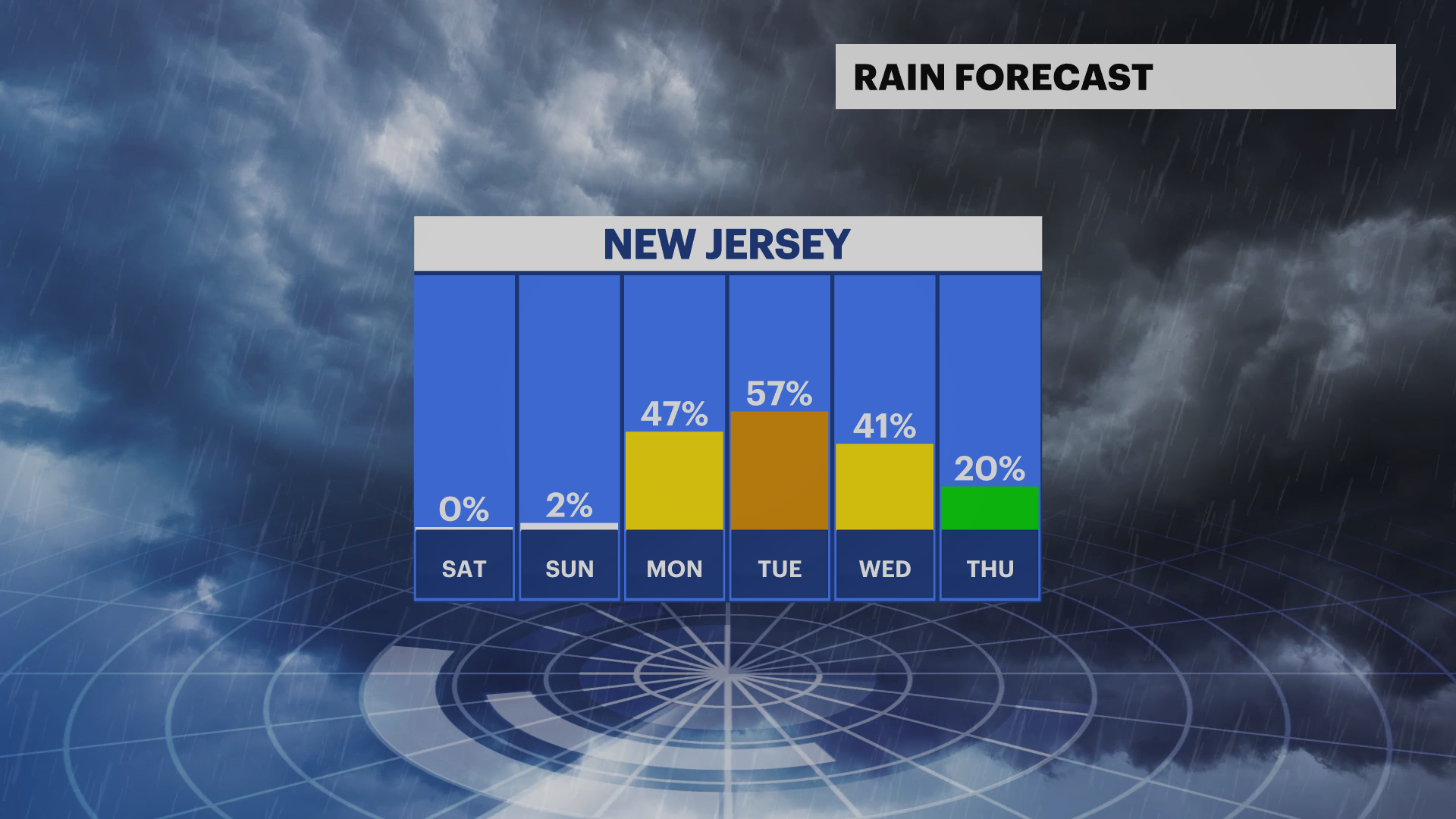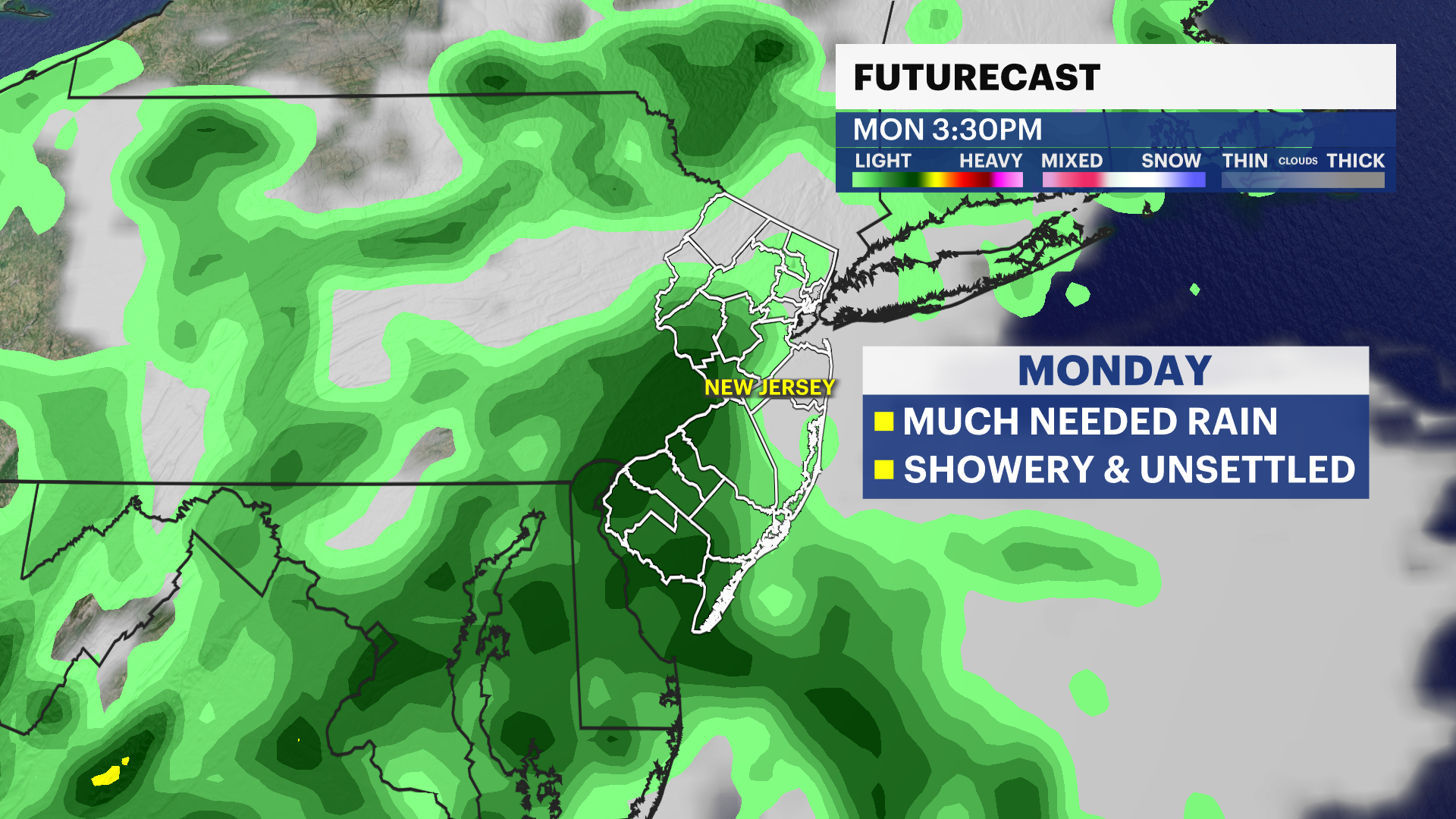 MONDAY: Possibility of some light rain sprinkles in the morning, with some clouds. Daytime highs in the upper-70s. Rain possibly in the afternoon and evening, leading into Tuesday. Overnight lows in the upper-60s.