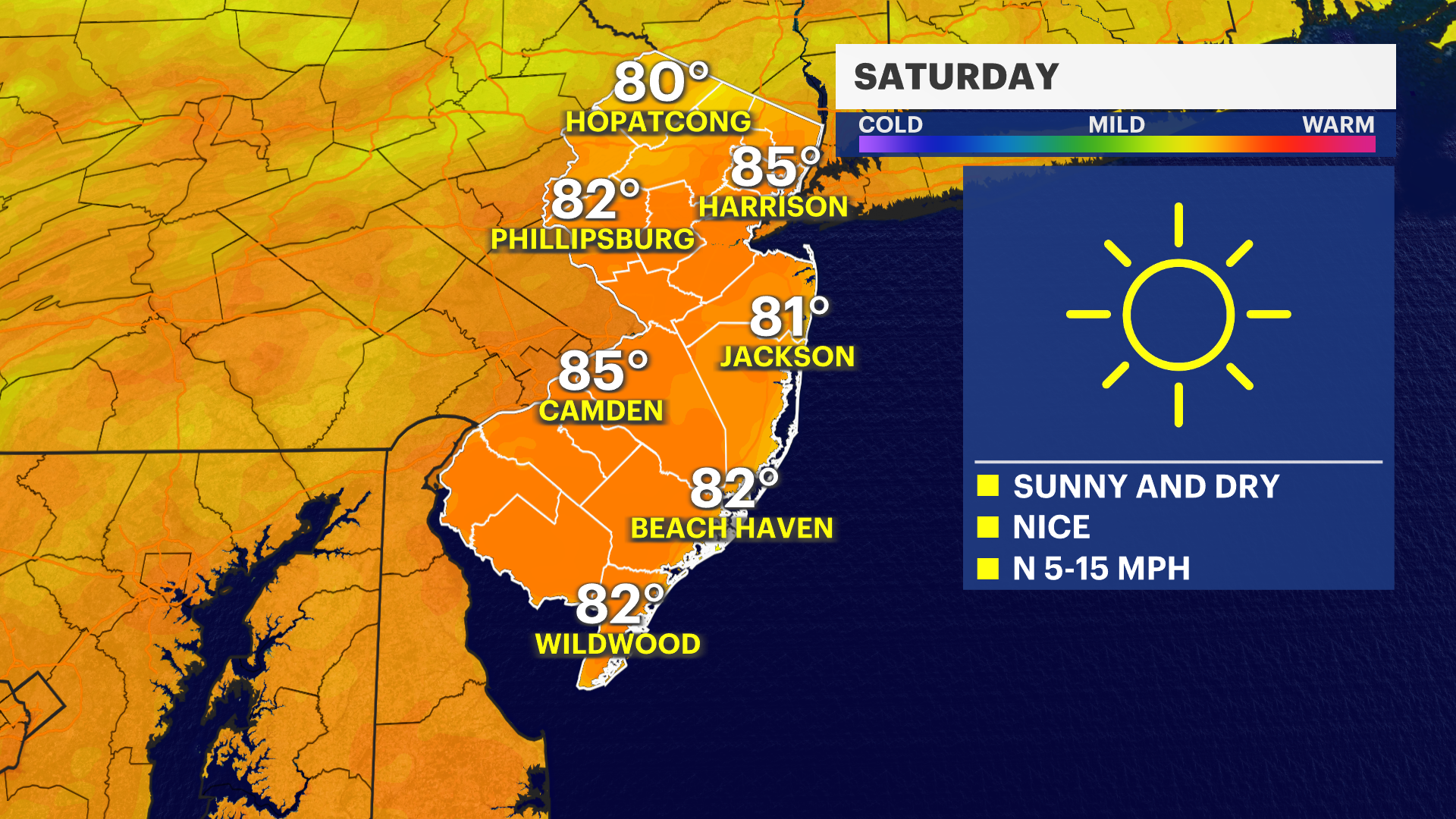 SATURDAY: Plenty of sunshine. Low humidity and dry conditions. Daytime highs around 82 degrees. Overnight lows around 65.