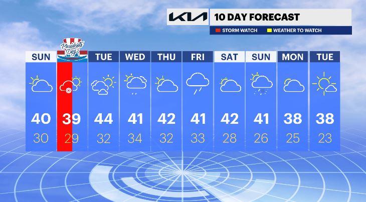 Temperatures are in the 40s for most of the 10-day which is the mildest so far this year. However, there are several disturbances to watch, one on Wednesday which will bring rain, and another on Friday and into next weekend. There's a chance temperatures will turn cold enough next weekend for some winter weather, but at this time the risk is low.