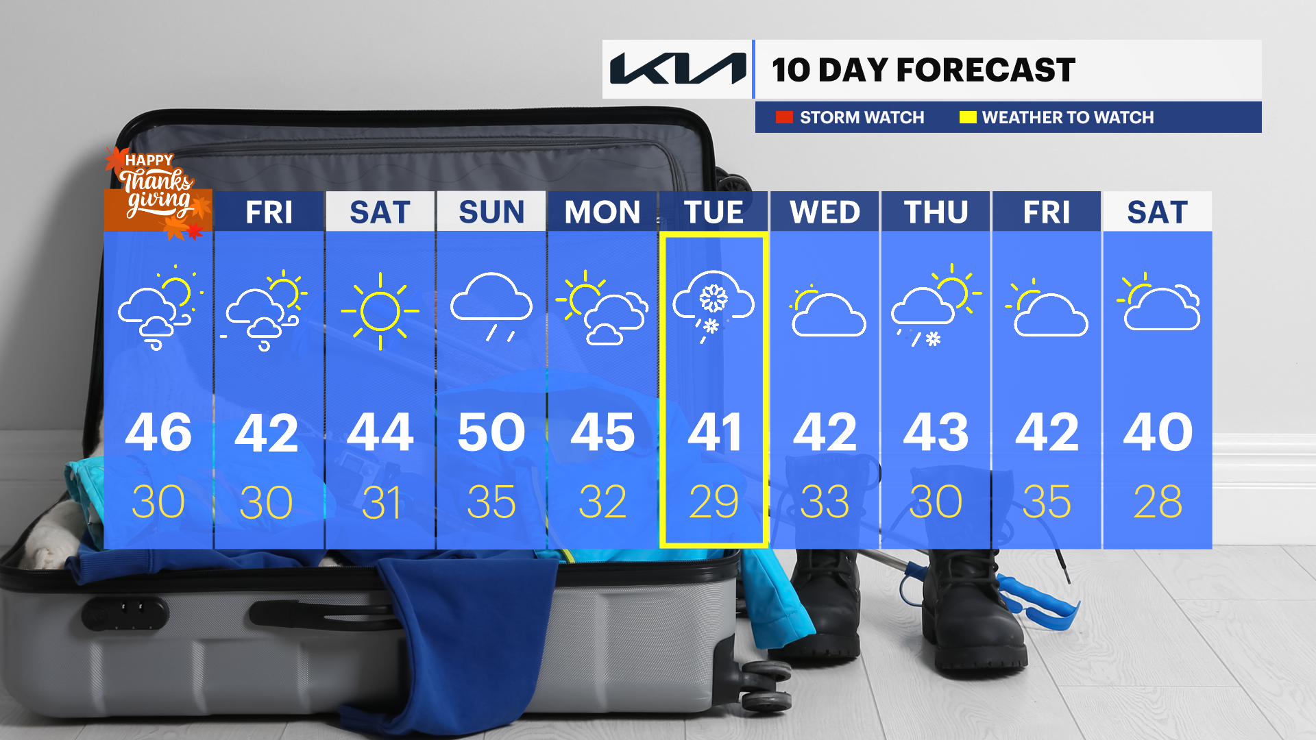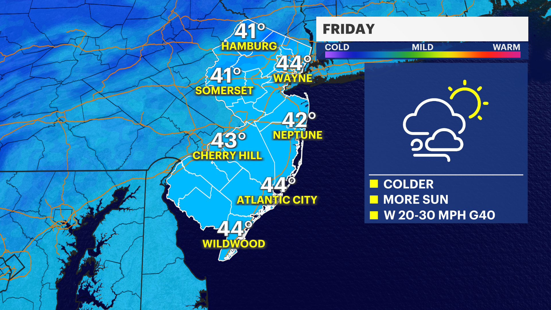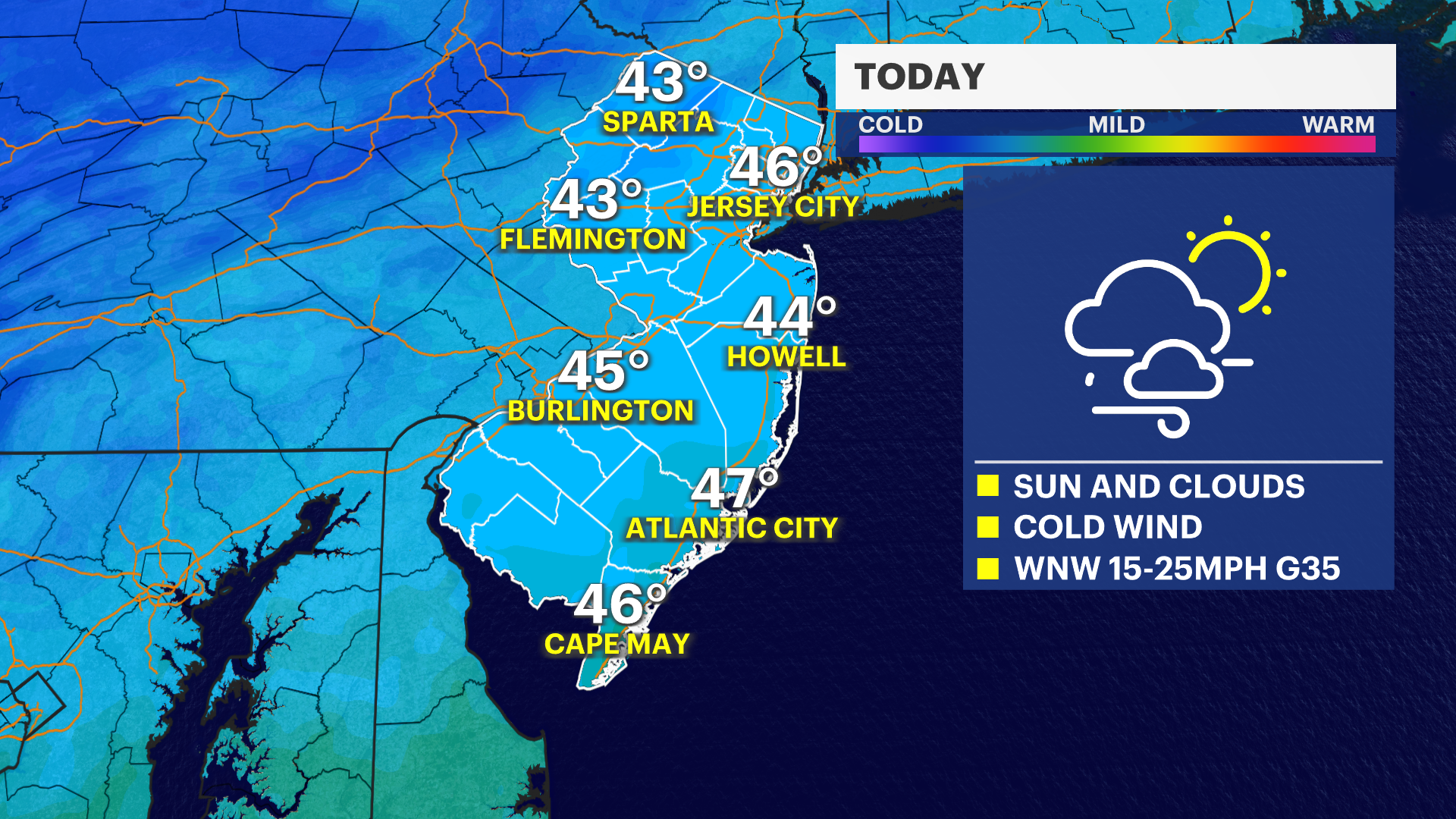 Weather will not impact Thanksgiving plans today, but it's our coldest Garden State in 7 years. High temperatures are in the mid 40s, but it feels like the mid 30s with wind gusts occasionally reaching 30 mph this afternoon. Expect a nice mix of sun and clouds. Tonight, temperatures will drop below freezing and it will feel like the 20s, even the teens in North Jersey, by Friday morning.