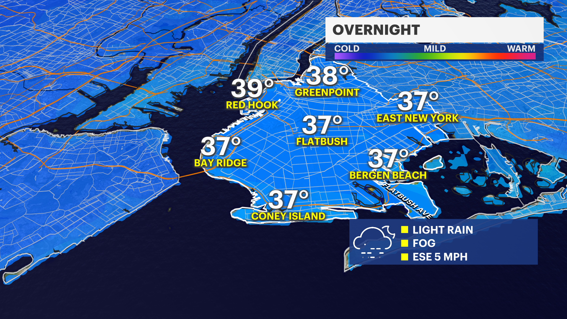 OVERNIGHT: Lows in the high 30s. Rain and fog.
