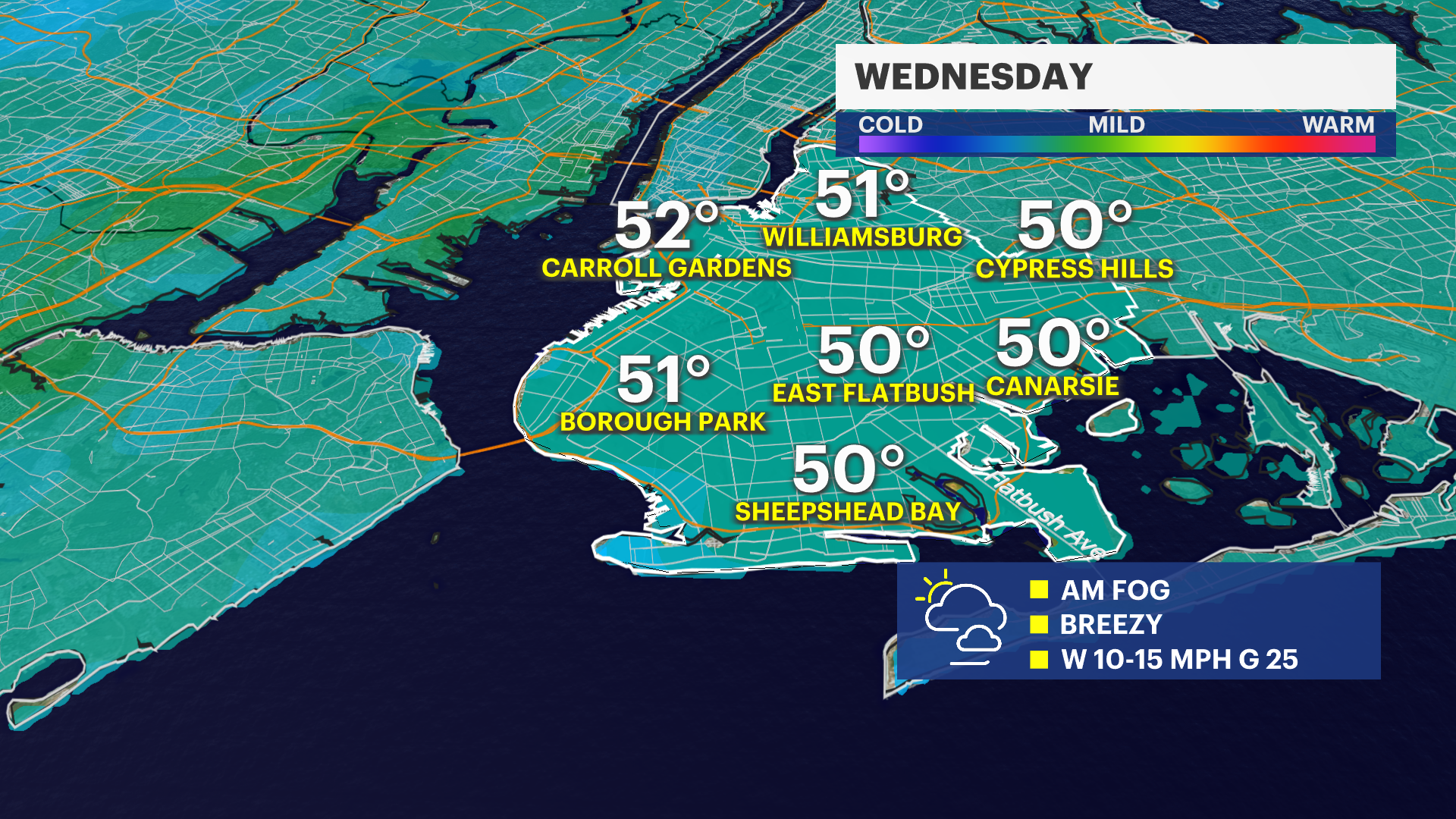Breeziness will pick of for Wednesday, zapping some of the warmth from a near 50-degree day. You'll still want to be bundled as though temperatures are in the 40s with gusts around 25 mph making things feel colder.