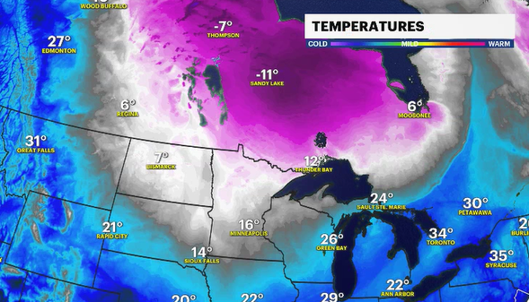 The air is straight form Hudsons Bay Canada. Arctic in nature, and the airmass has temps that are well below the seasonable average.