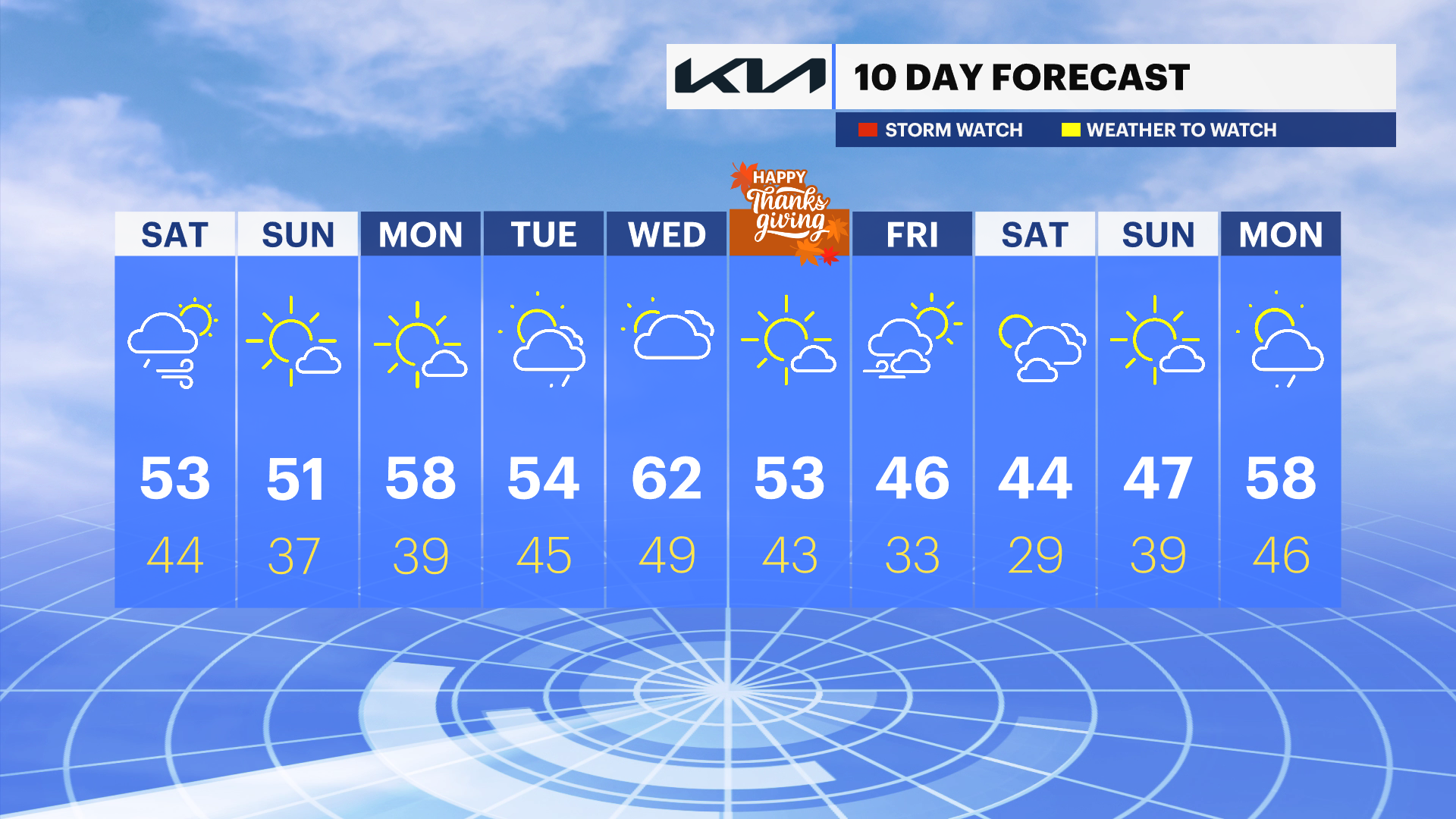 The weather stays nice and sunny until Tuesday. Travel before Thanksgiving may be disrupted due to the rain coming in for Tuesday and Wednesday.