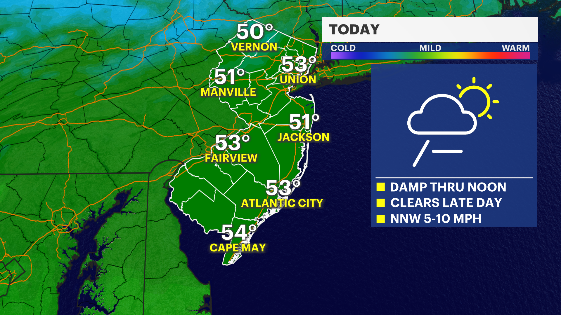 The rain and sky should clear by about noontime today but before that point, showers will be moving through all of New Jersey.