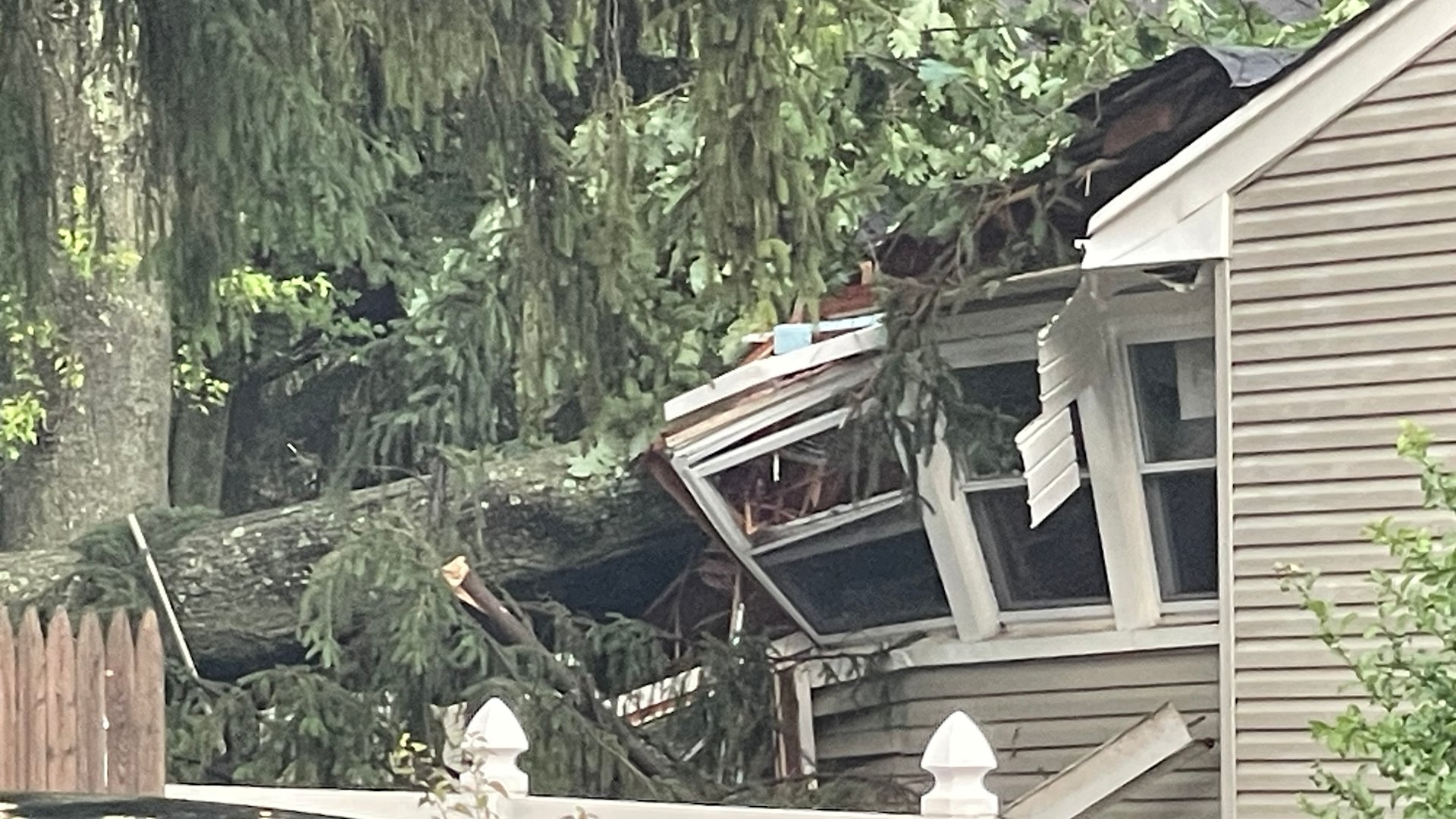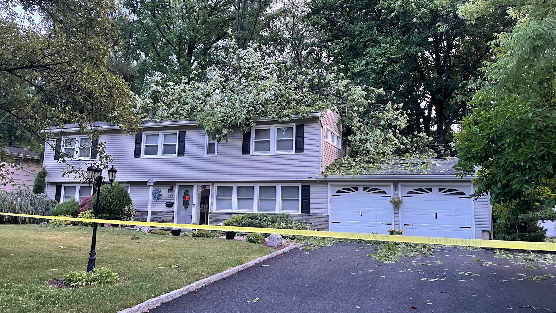 A large tree fell on top of a house on Longview Drive in Mountainside. The house, which was for sale and has an "under contract" sign in the front yard, is roped off and off limits until further inspection.