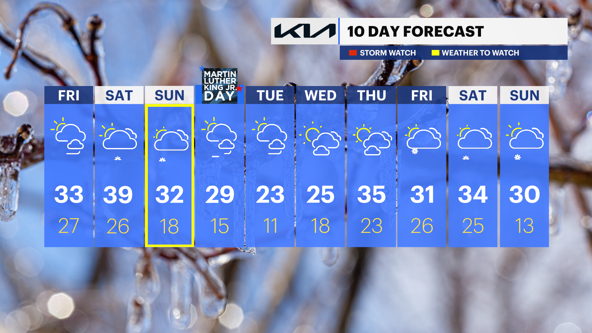 SATURDAY: Mostly cloudy with a chance of snow showers. Highs: upper 30s. Lows: mid 20s.