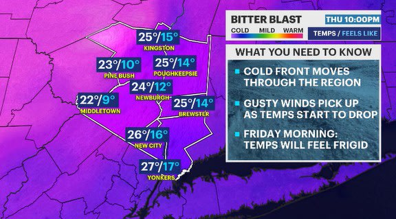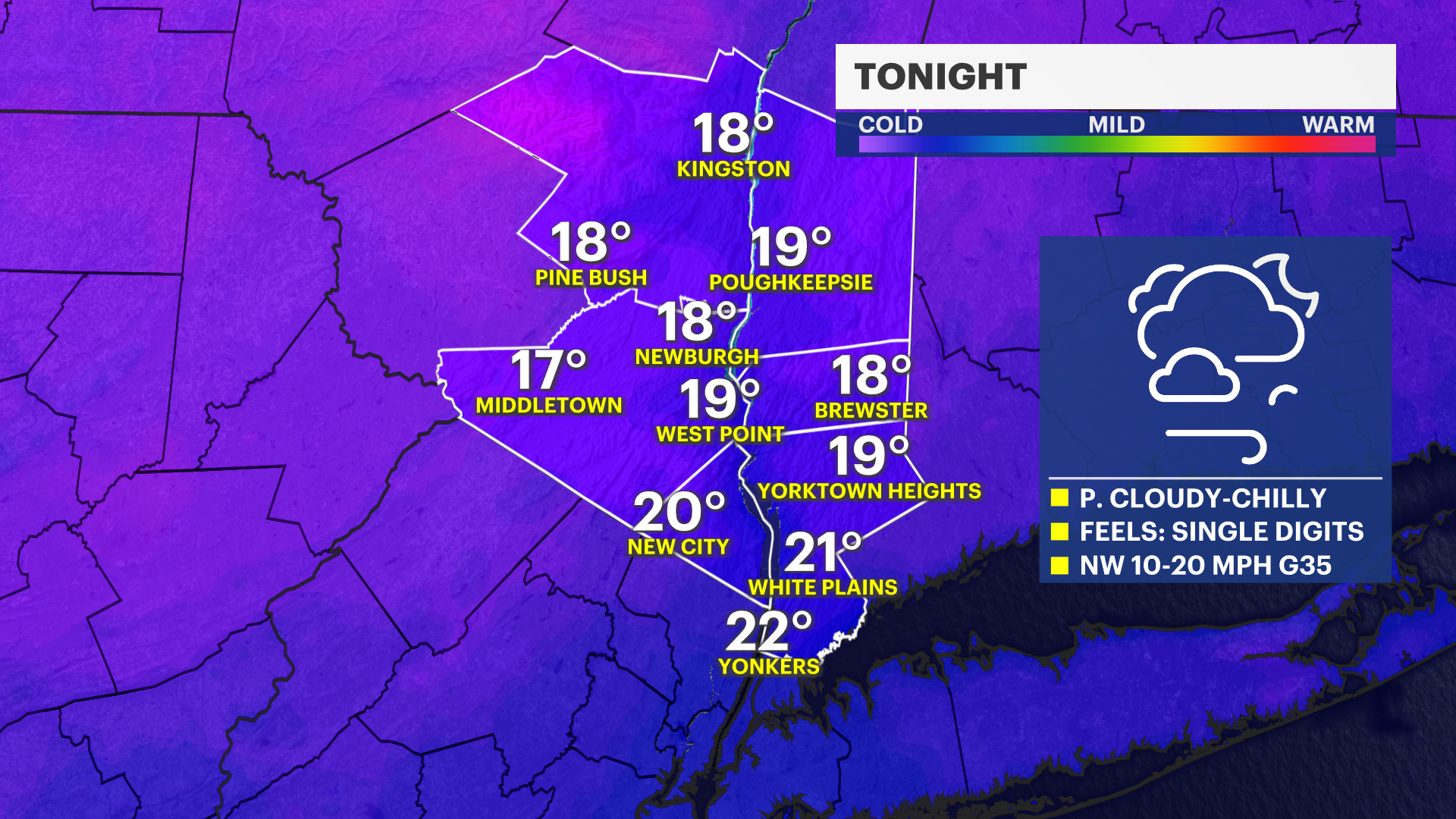 OVERNIGHT: Partly cloudy but mainly frigid as temps continue to feel icy. Lows: mid 10s to low 20s.
