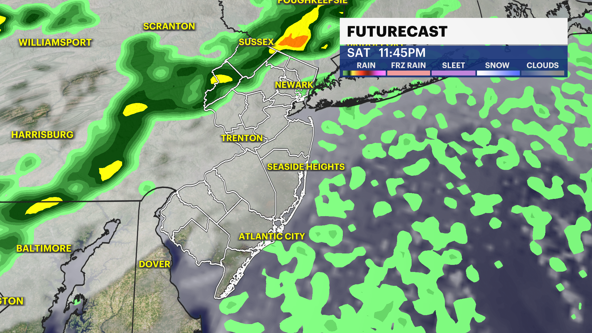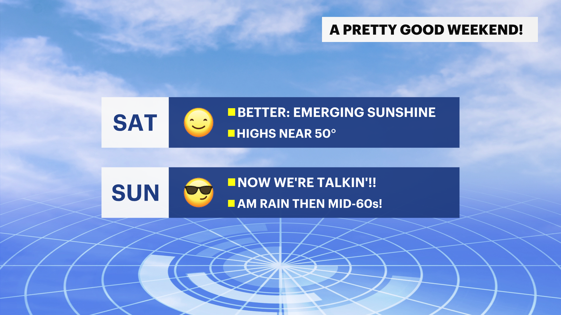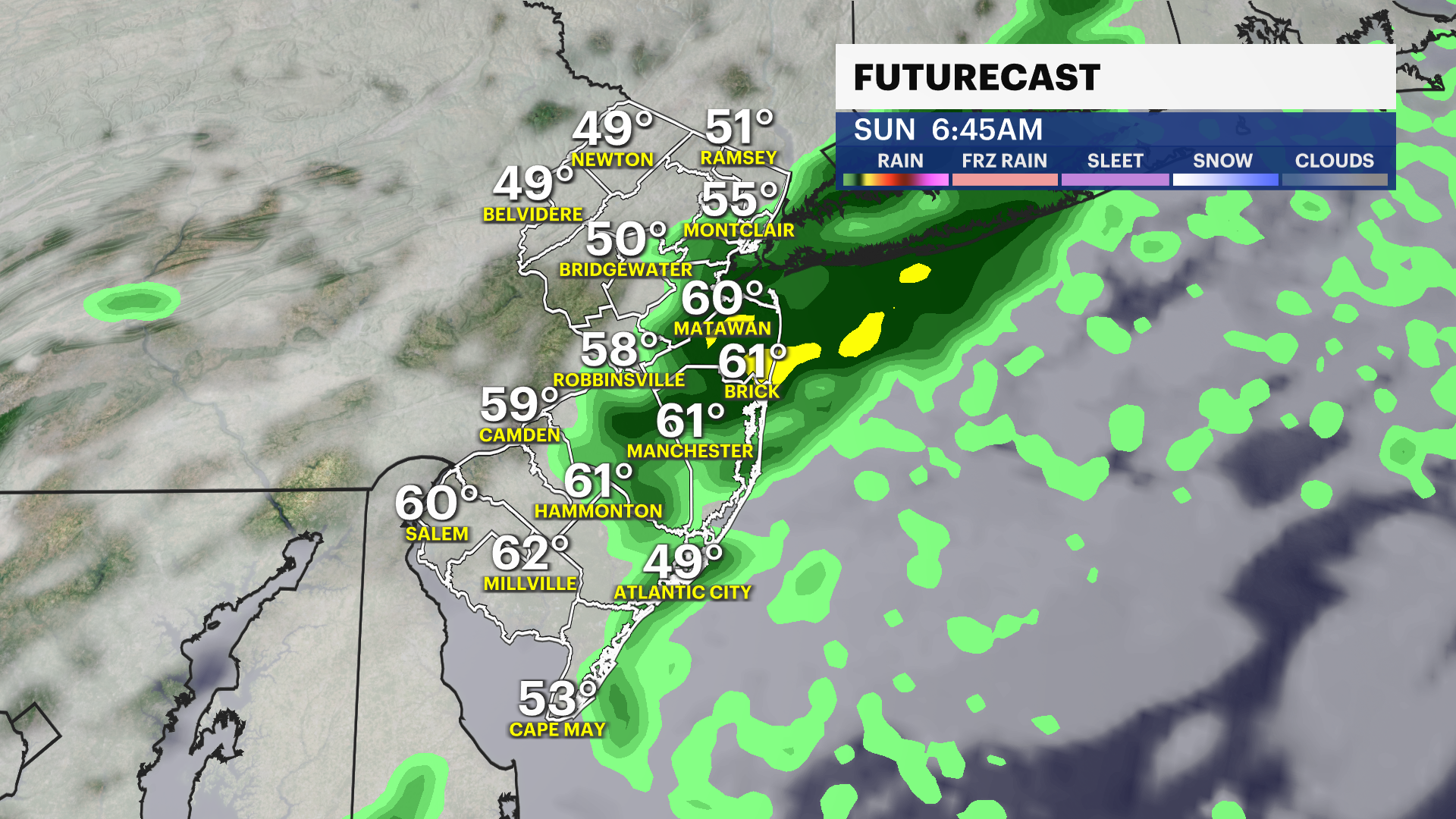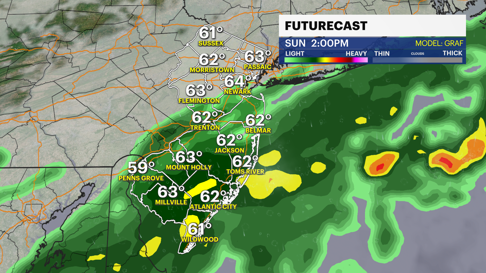 Showers pass across the state slowly overnight Saturday into Sunday and this clears out the unsettled weather. Rain lingers very early Sunday but it improves as the sun rises near 7 a.m.. The whole day looks beautiful with highs in the mid-60s. It feels warmer in the direct sun.