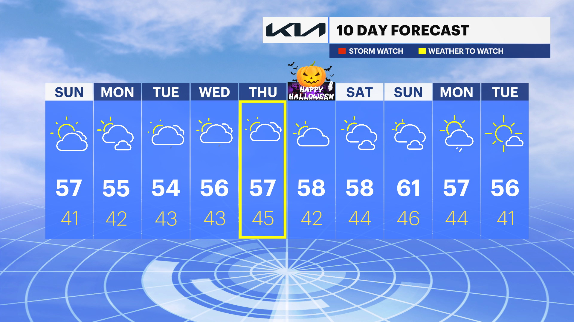 Temperatures are running cooler than usual for late October though. Today will feature patchy morning fog, lows in the 40s, and highs in the mid-50s. The workweek starts off chilly, with highs struggling to rise above the mid-50s after a start in the frosty 30s. As high pressure moves out Monday, a low-pressure system tracking through the Southeast will bring increasing rain chances from Tuesday through the end of the week. The wettest day of the week may be Thursday with conditions hopefully improving by Halloween night. Stay tuned as we fine tune the forecast!