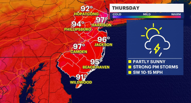 WHAT’S NEXT: Temperatures in the 90s for Wednesday through Saturday. Conditions will cool slightly by Sunday, with daytime highs in the 90s for the upcoming week. New Jersey residents are urged to drink plenty of fluids, limit their time outdoors and wear loose-fitting clothing.