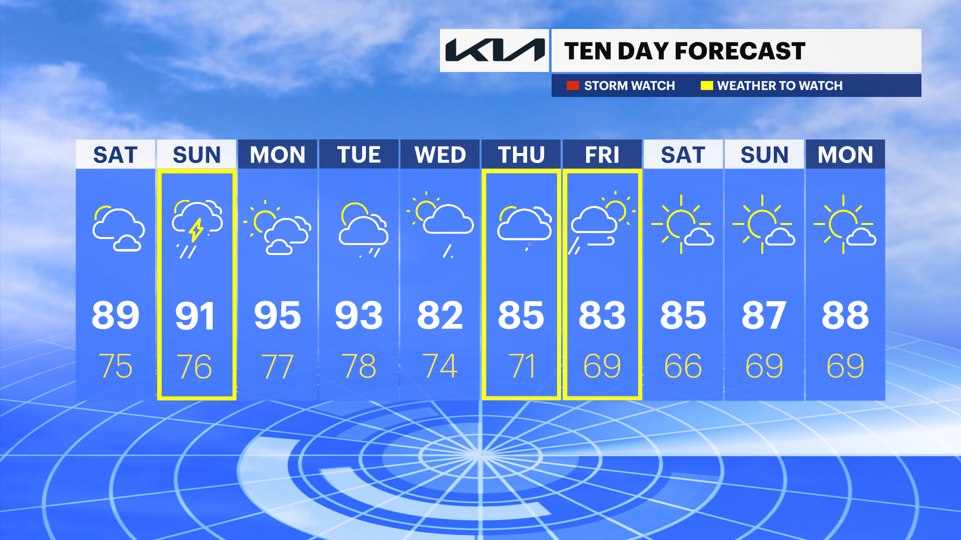 SATURDAY: Mostly cloudy skies. Daytime highs in the upper-80s and low-90s. Potential for isolated thunderstorms. Overnight lows around 75 degrees.