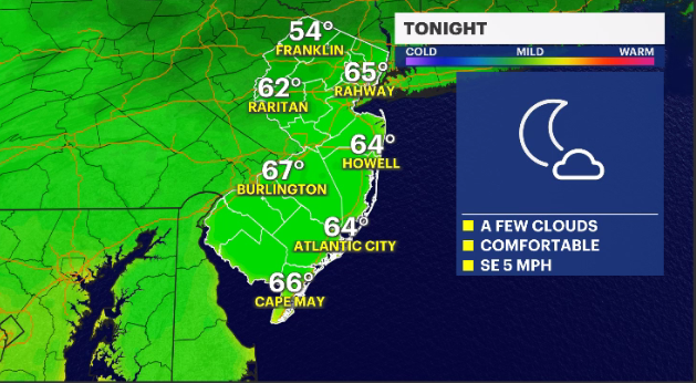 OVERNIGHT: A few clouds, with comfortable conditions. Overnight lows in the 50s and 60s.