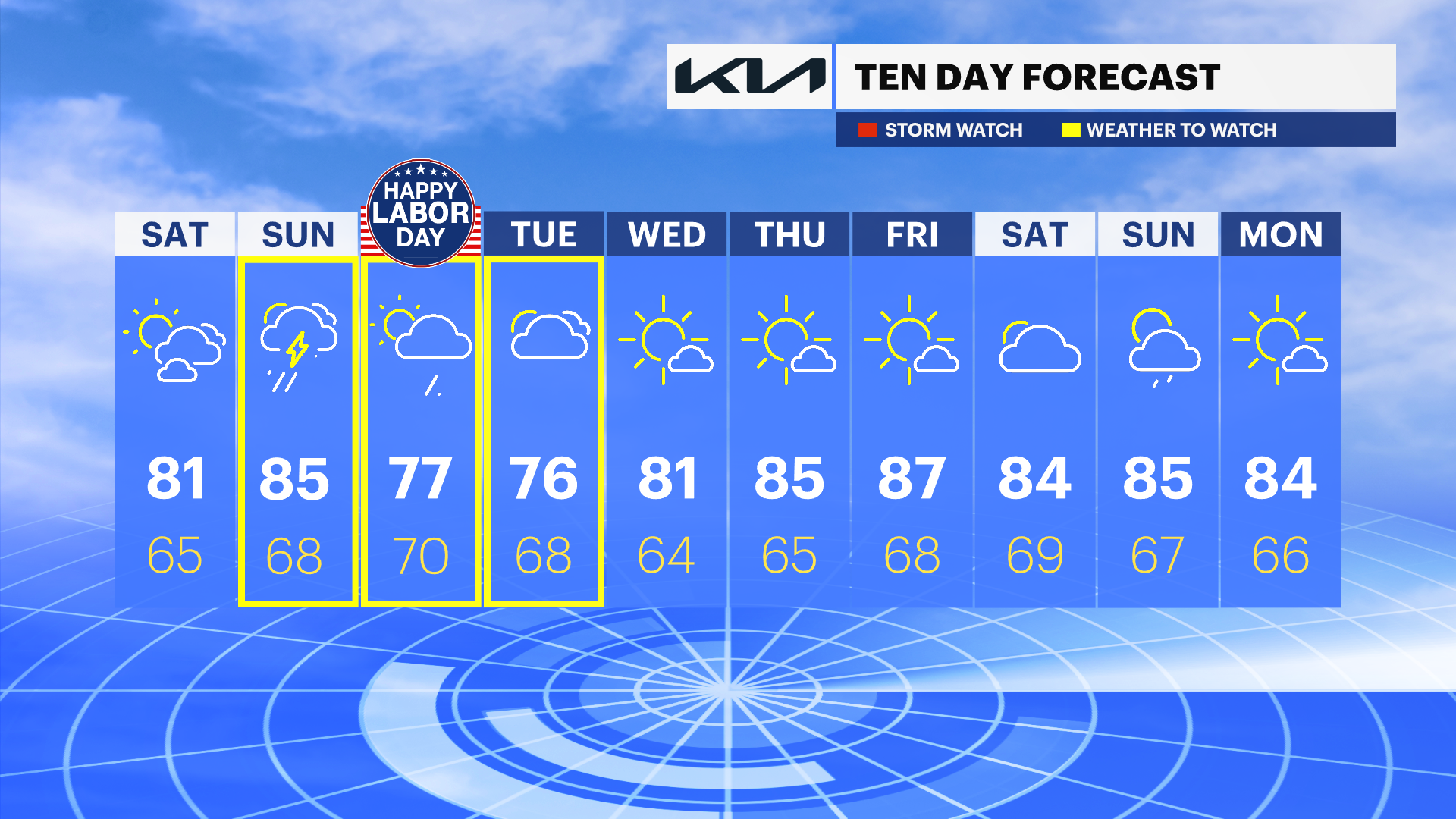 SATURDAY: Slight increase in humidity. Daytime highs in the low-80s. Mix of sun and clouds. Overnight lows around 65.