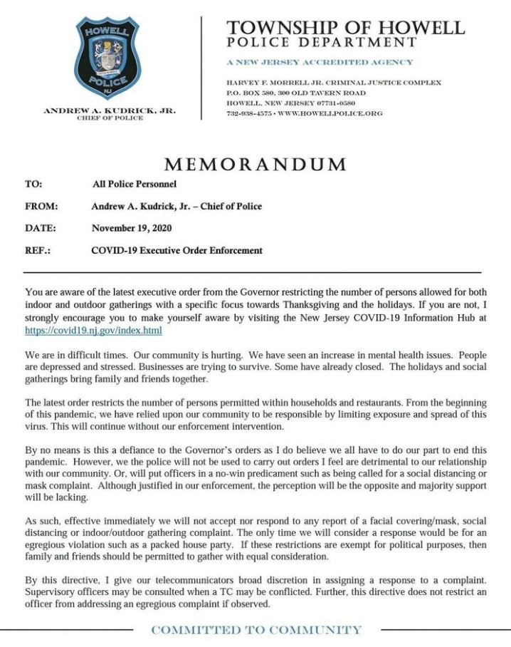 Howell Police Chief Andrew Kudrick tells News 12 New Jersey that the memo is not meant to be in defiance of Murphy’s executive orders. But he says that it does represent the beliefs of many police chiefs that he has spoken with.