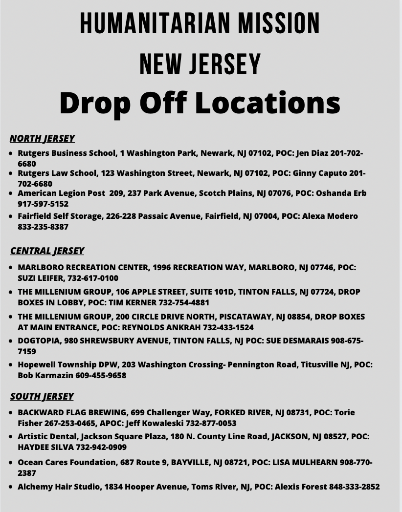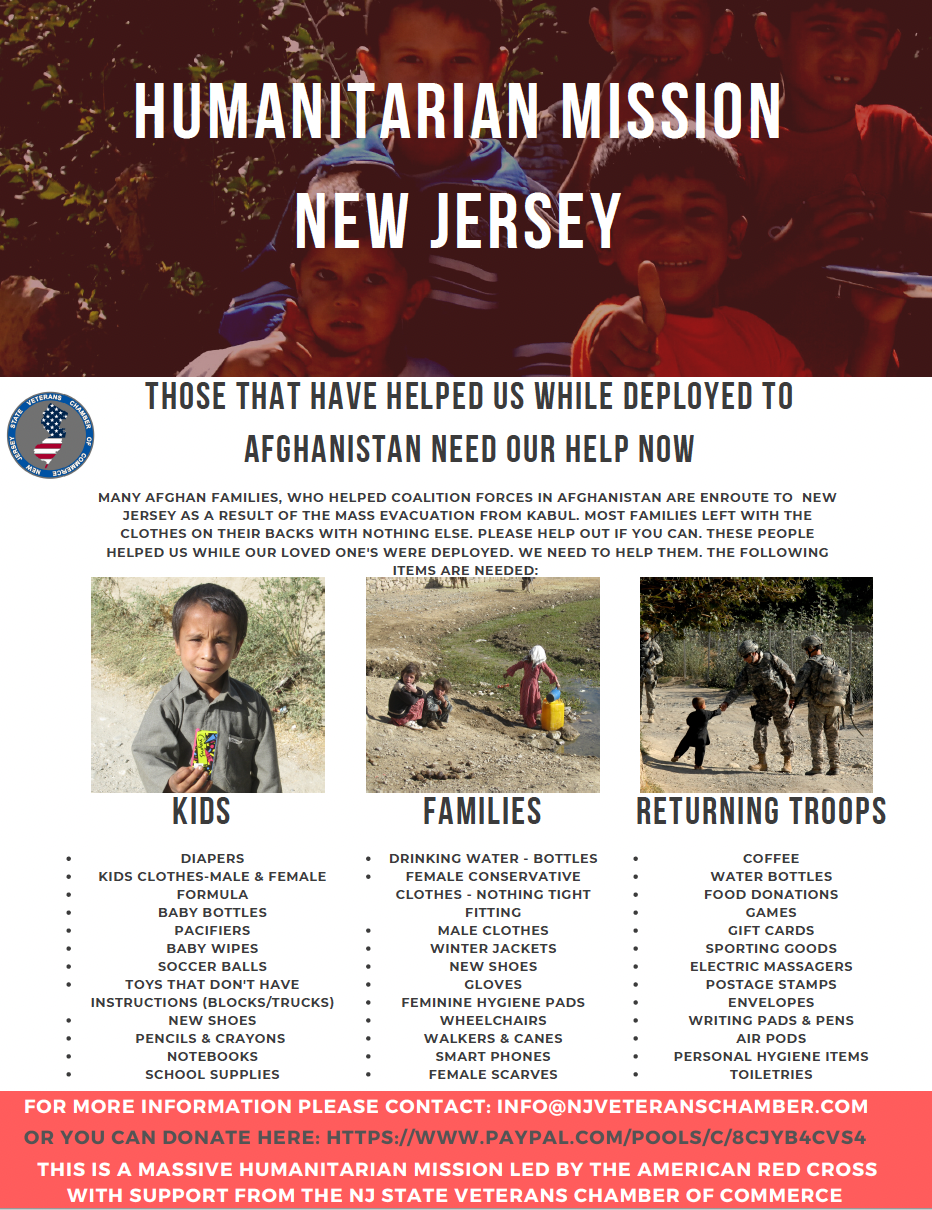 The NJ Veterans Chamber of Commerce organized the humanitarian effort with guidance from the Red Cross and the Joint Base. The Chamber of Commerce is working with other veteran groups and veteran volunteers who look to give back to those who helped them and our country for two decades.