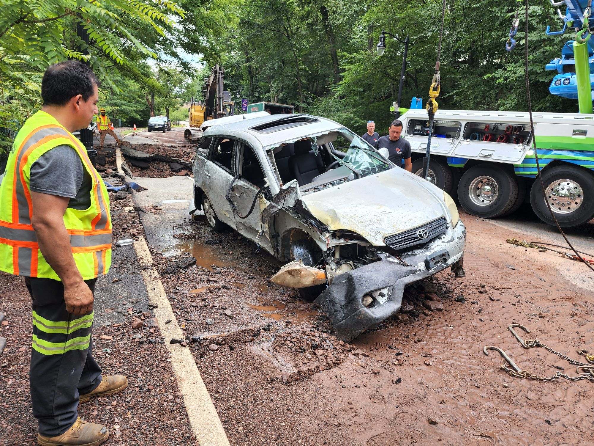Pagan’s car sank so deep that a crane had to be brought in to get it out Wednesday afternoon. It was full of rocks and other debris.