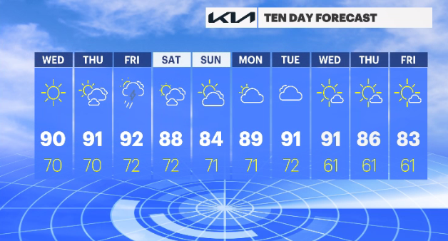FRIDAY: Day starts off mostly sunny with daytime highs in the upper-80s. Thunderstorms have the potential to develop by Friday night. Wind gusts have the potential to reach 40 mph. Overnight lows in the upper-60s.