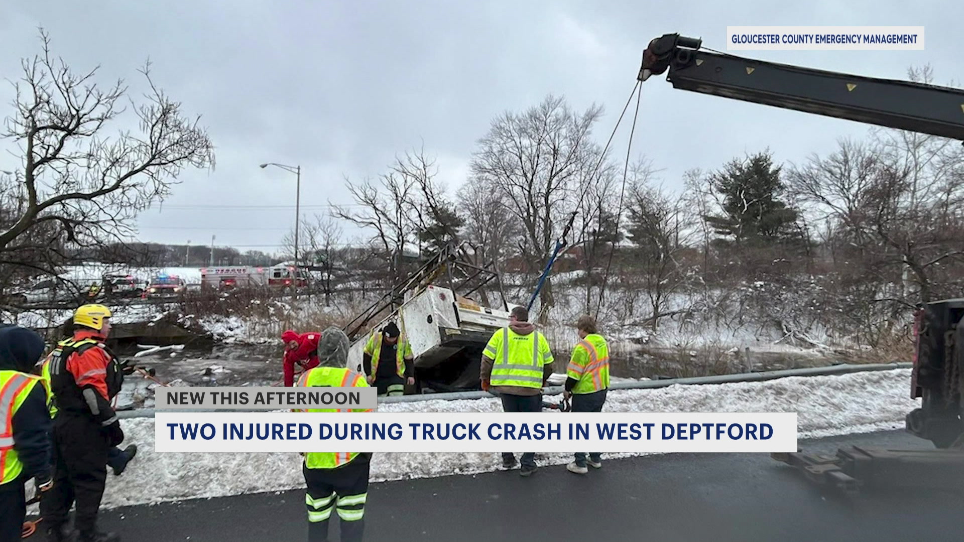 Utility truck goes over guardrail and triggers hazmat response in West Deptford