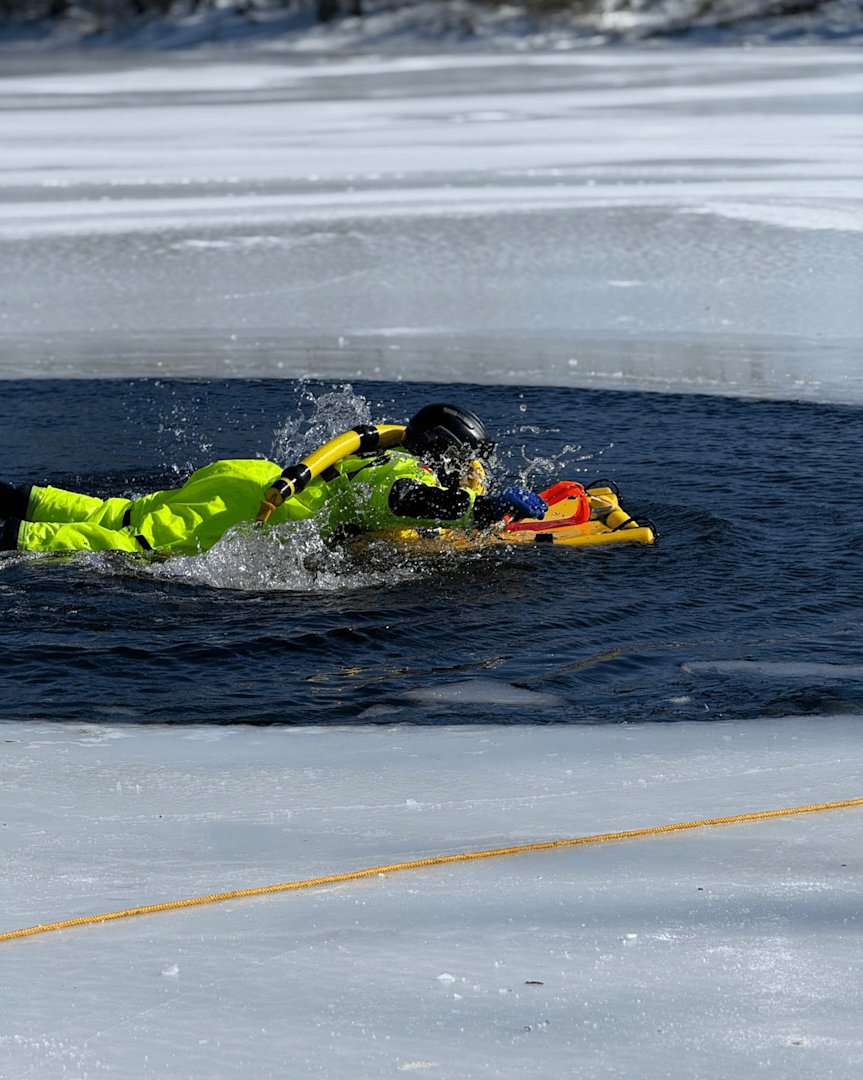 City officials say that the Jersey City Fire Department's Rescue 1 squad 4 B group was conducting ice rescue training at the Jefferson Avenue reservoir on Monday. That's when they saw the bird stuck to the ice and unable to fly away.
