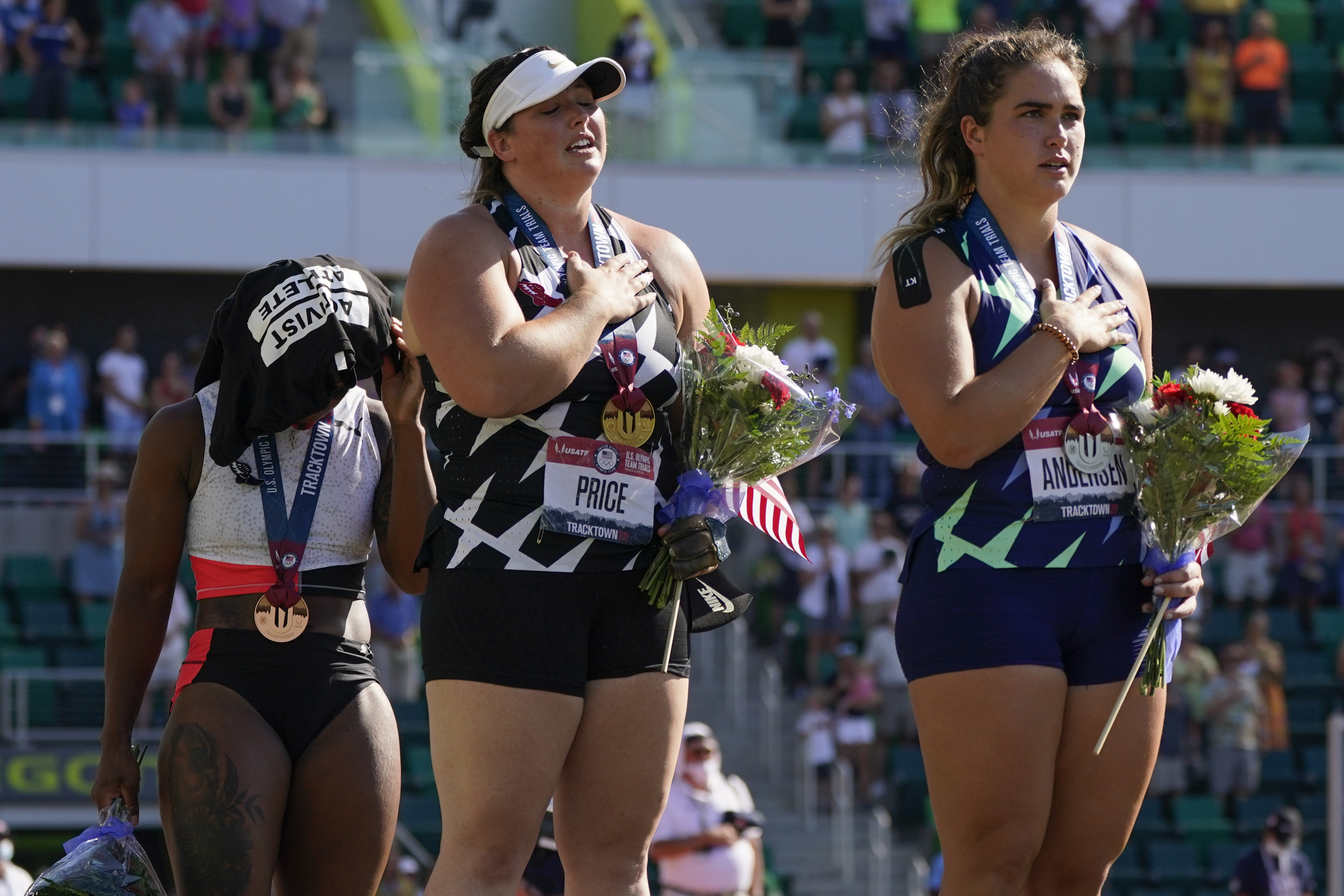 Gwendolyn Berry, left, drapes her Activist Athlete T-Shirt over her head as DeAnna Price and Brooke Andersen stand for the national anthem after the finals of the women's hammer throw at the U.S. Olympic Track and Field Trials Saturday, June 26, 2021, in Eugene, Ore. Price won, Andersen was second and Berry finished third. (AP Photo/Charlie Riedel)