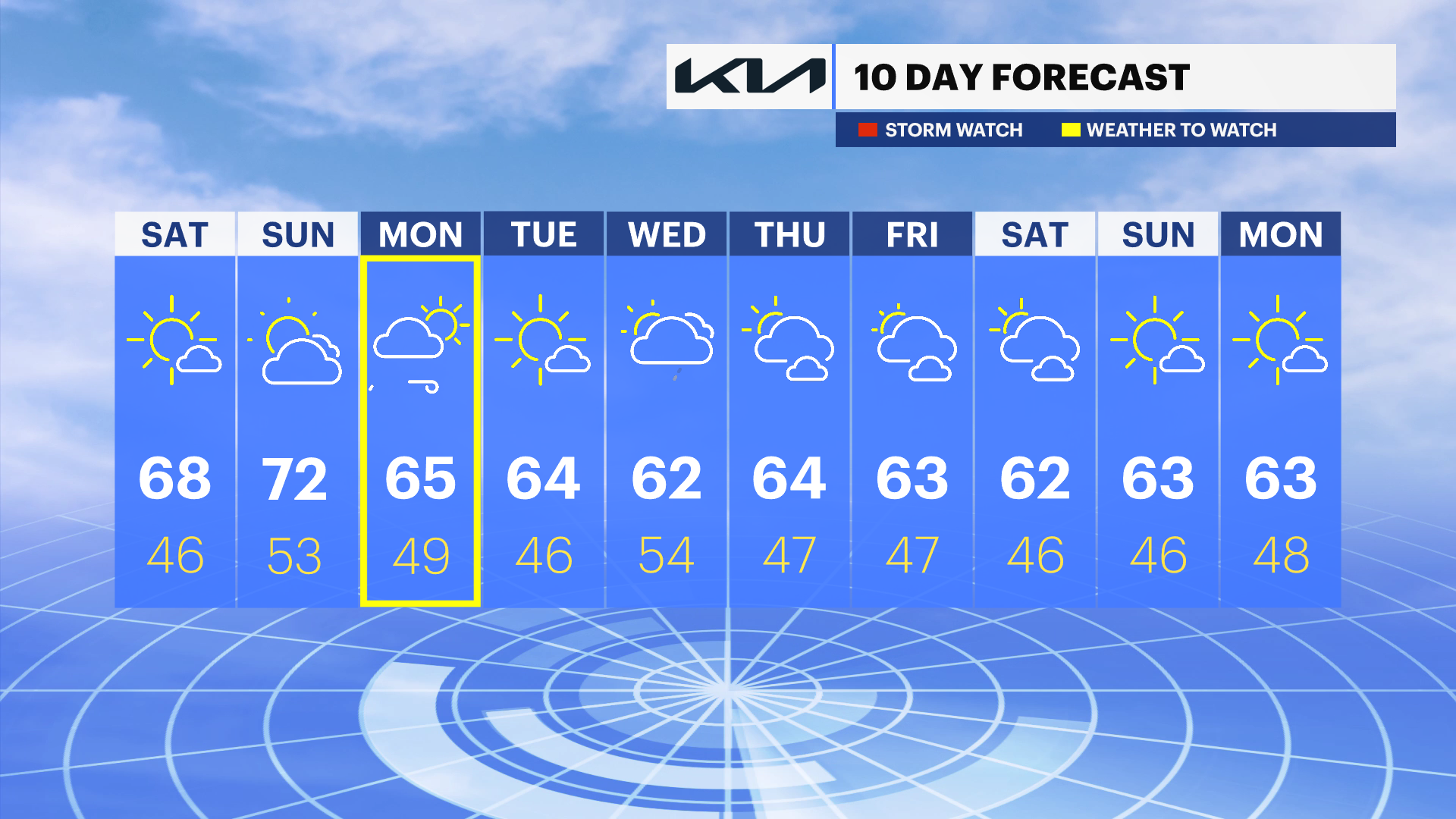 SUNDAY: Clouds build and wind increases. Late afternoon rain. Highs in the low 70s, lows in the higher 50s.