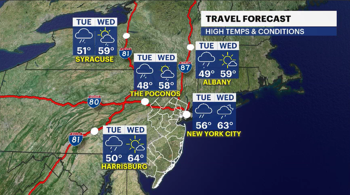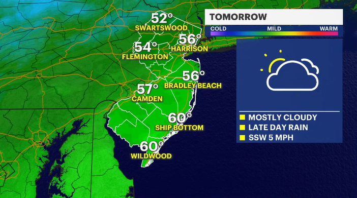 The center of the storm stays well west of New Jersey, but waves of rain and possible thunderstorms (Tuesday night into Wednesday morning) will meander across the state.