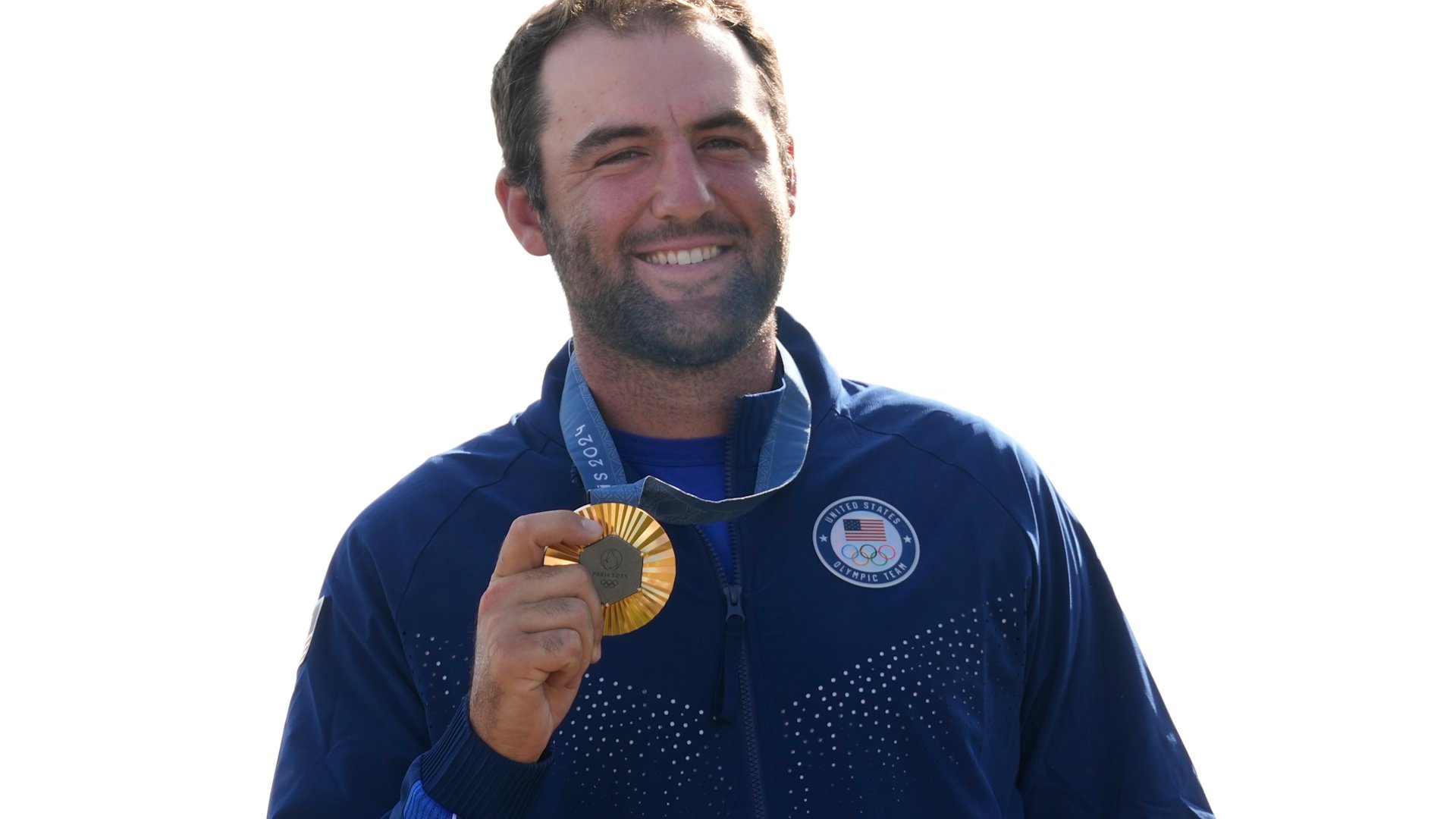 Gold medalist Scottie Scheffler, of the United States, poses with his medal following the medal ceremony for men's golf during the medal ceremony at the 2024 Summer Olympics, Sunday, Aug. 4, 2024, at Le Golf National in Saint-Quentin-en-Yvelines, France. Scottie Scheffler, of the United States, won the gold medal with Tommy Fleetwood, of Britain, silver and Hideki Matsuyama, of Japan, the bronze.(AP Photo/Matt York)