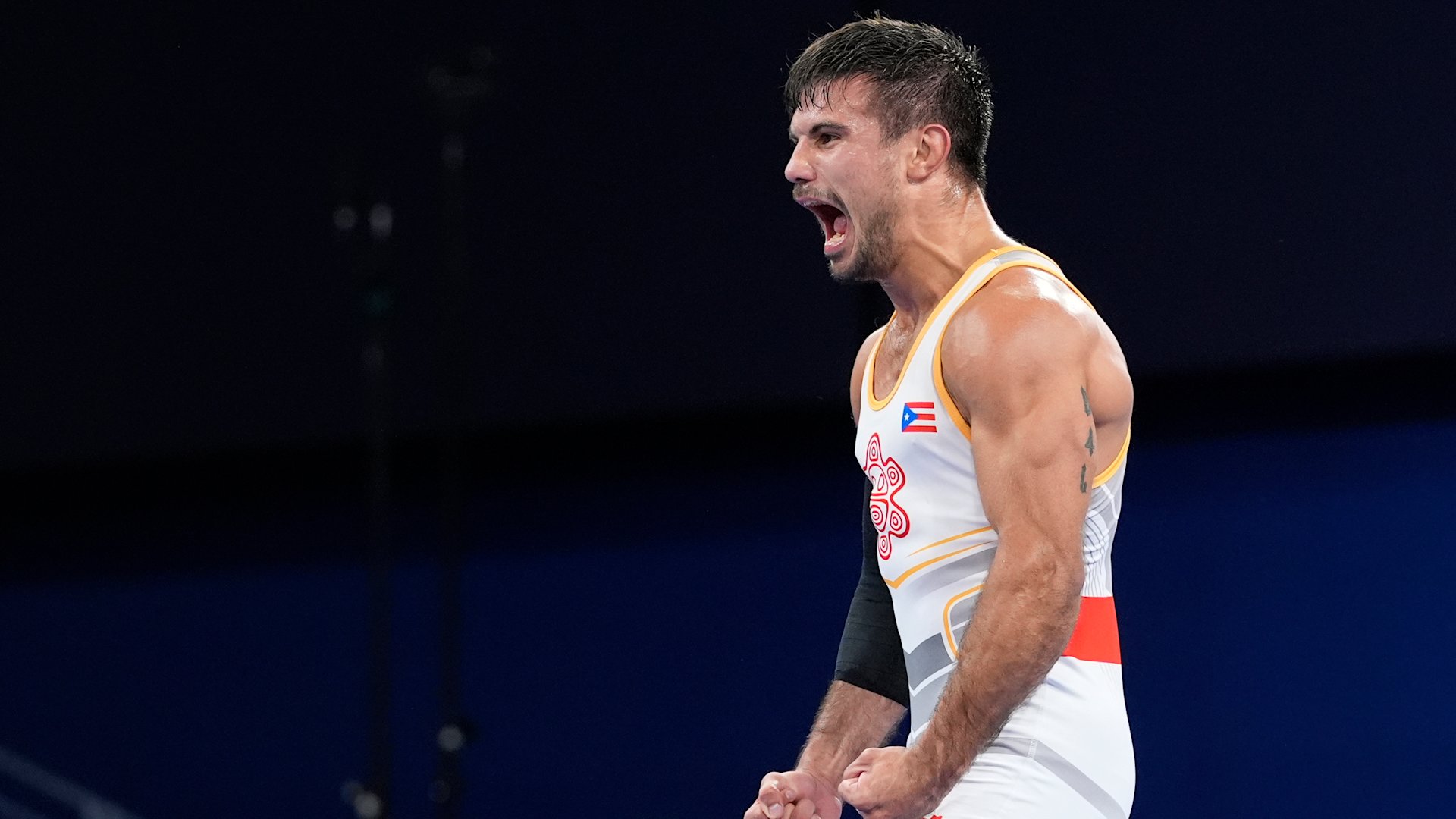 Puerto Rico's Sebastian Rivera celebrates after defeating Mongolia's Tumur Ochir Tulga in their men's freestyle 65kg bronze medal wrestling match, at Champ-de-Mars Arena, during the 2024 Summer Olympics, Sunday, Aug. 11, 2024, in Paris, France. (AP Photo/Eugene Hoshiko)