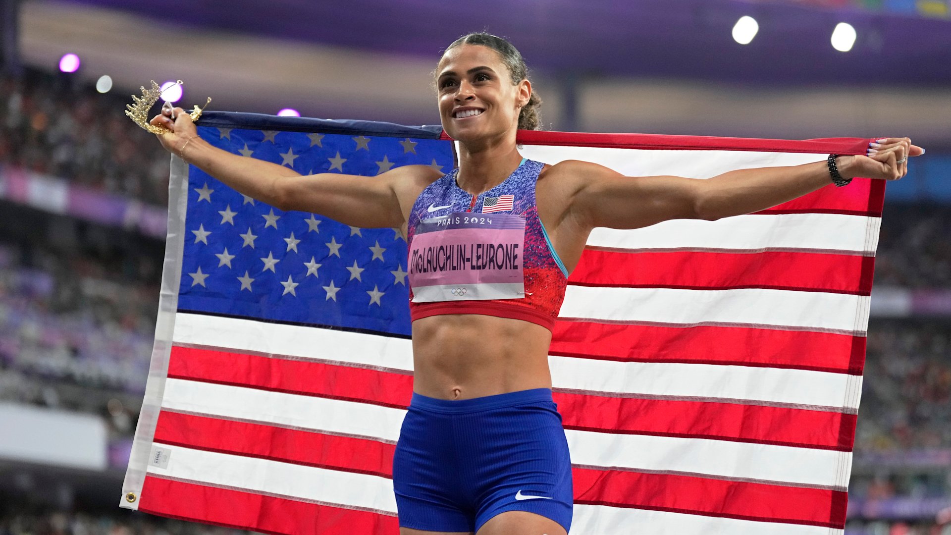 Sydney McLaughlin-Levrone, of the United States, poses after winning the gold medal in the women's 400 meters hurdles final at the 2024 Summer Olympics, Thursday, Aug. 8, 2024, in Saint-Denis, France. (AP Photo/Ashley Landis)
