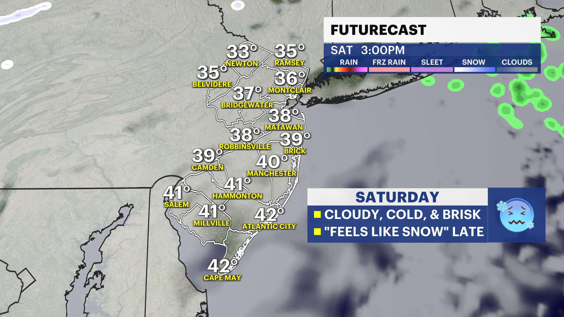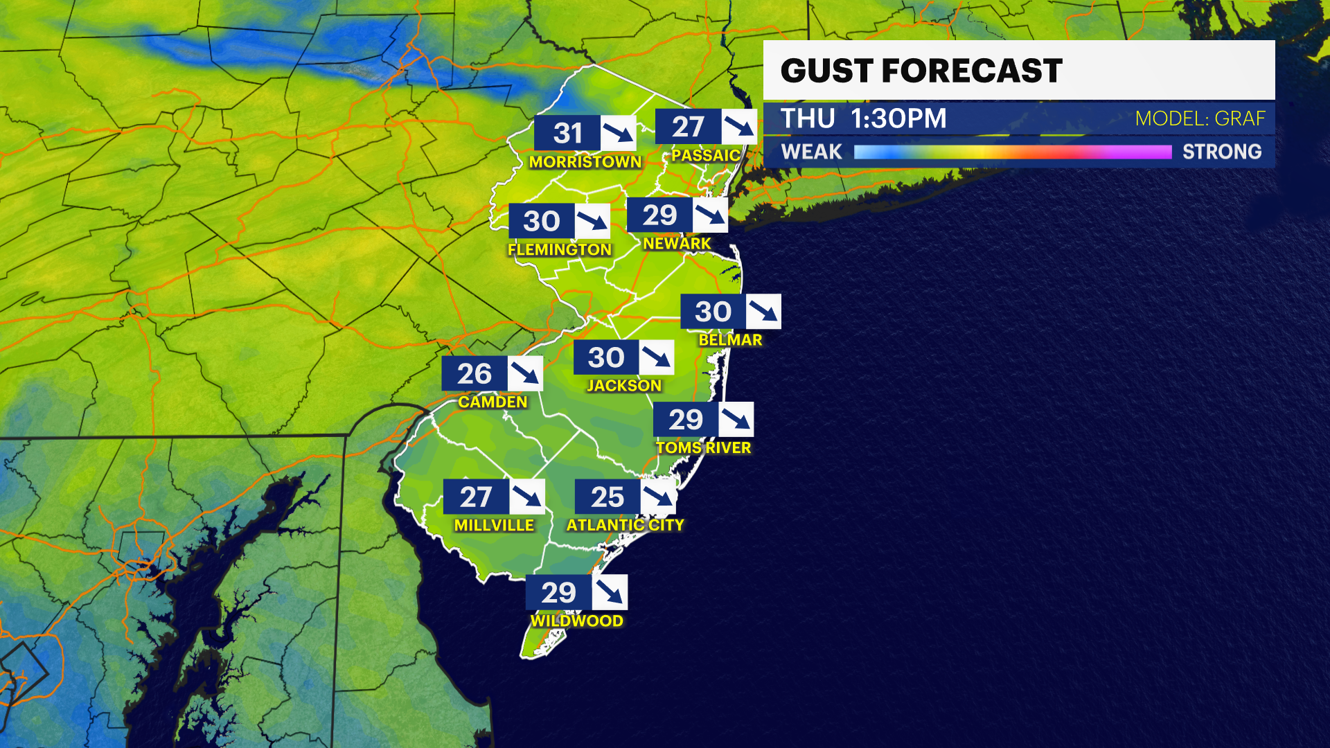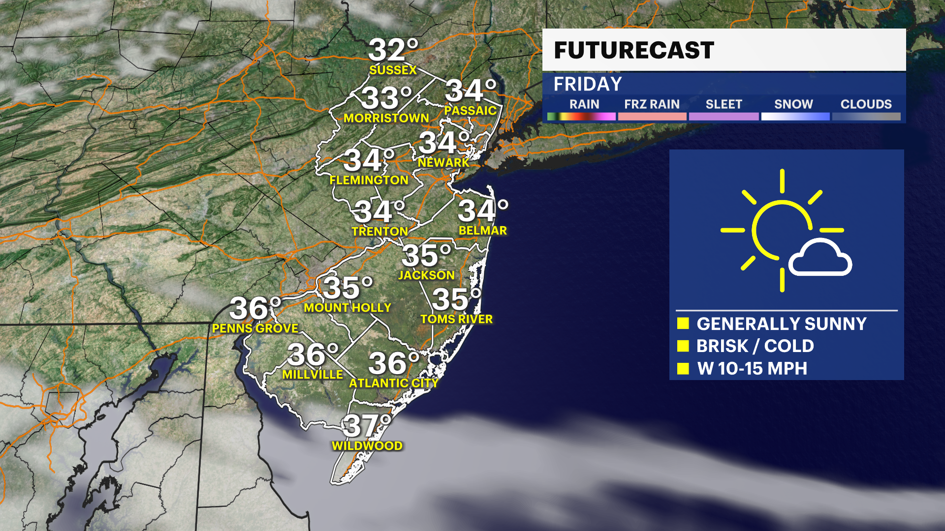 Windy and cold weather lingers across New Jersey for today with gusts 25-35 mph. Wind chills will be in the lower 20s throughout the day with air temperatures hovering in the lower to mid-30s all day long.